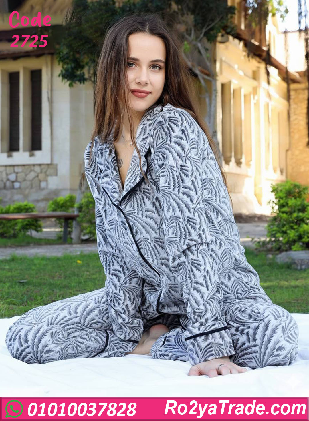 بيجامة شتوي حريمي موديل 2725 اختيار مثالي لكل ست بتدور على الراحة مع شكل أنيق ومرتب. التصميم مكوّن من قطعتين بطبعة أوراق هادية وعصرية، مع قميص بأزرار كاملة وحواف بلون غامق بتدي شكل شيك ومميز. البنطلون بقصة مريحة بوسط مطاطي بيوفّر حرية حركة من غير أي إحساس بالضيق. الخامة مناسبة للشتا، ناعمة على الجسم وبتحافظ على الدفا، وده بيخلي البيجامة عملية جدًا للاستخدام اليومي داخل البيت.