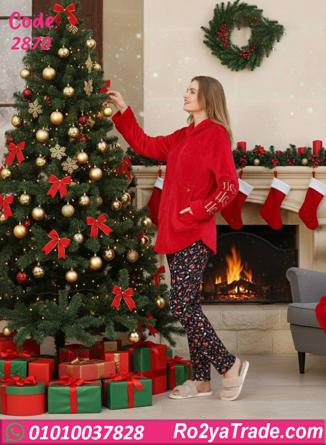 بيجامة شتوي حريمي موديل 2870 اختيار مثالي لأجواء الشتاء والاحتفالات. التصميم مكوّن من هودي قطيفة بجيب أمامي وقبعة مريحة، مع بنطلون بطبعة جذابة بتدي شكل عصري ومبهج. الخامة ناعمة على الجسم وبتوفر دفا ممتاز، مناسبة للبس اليومي داخل البيت وخصوصًا في الجو البارد. الطقم عملي وسهل اللبس وبيجمع بين الشياكة والراحة في نفس الوقت.