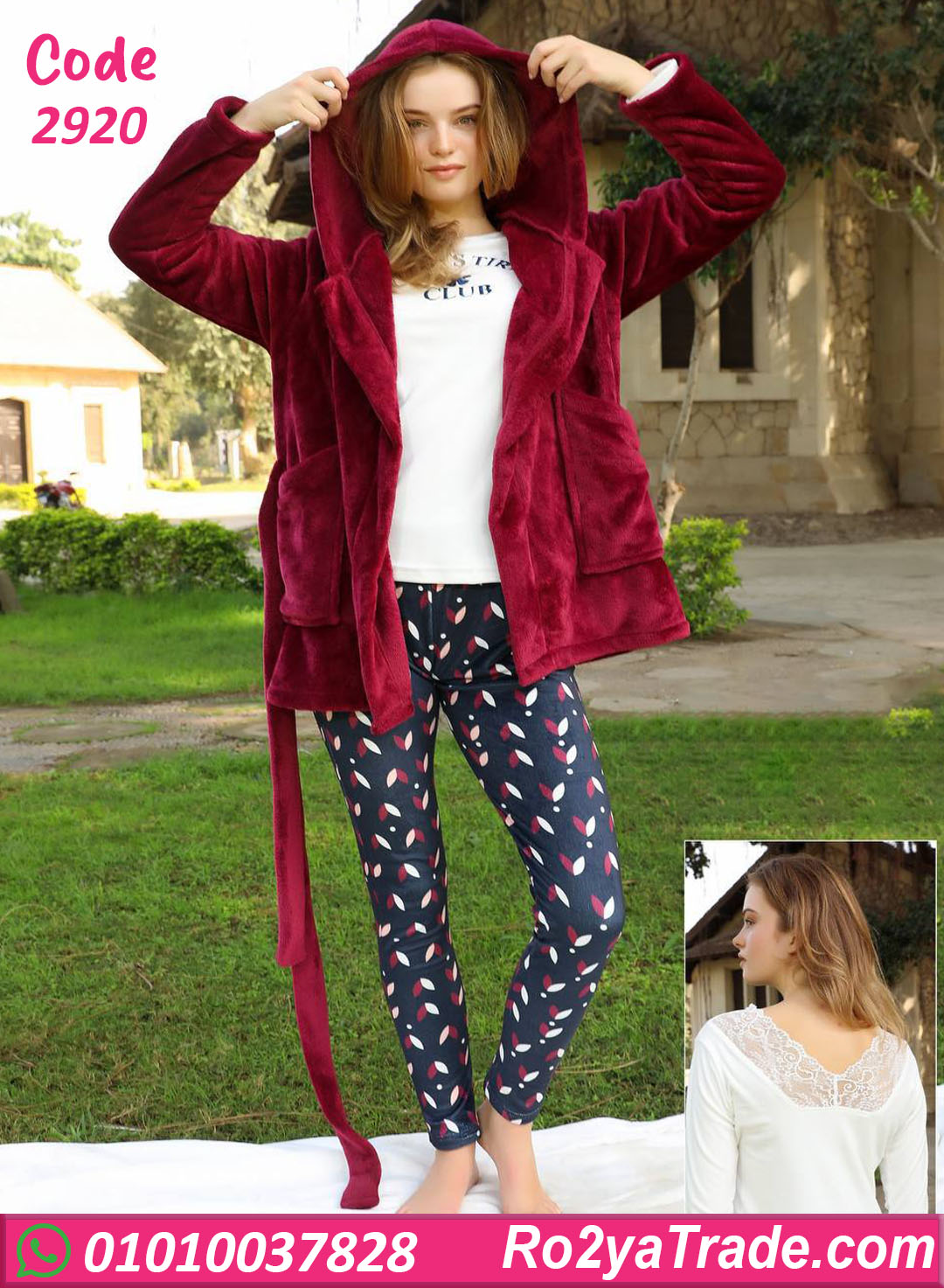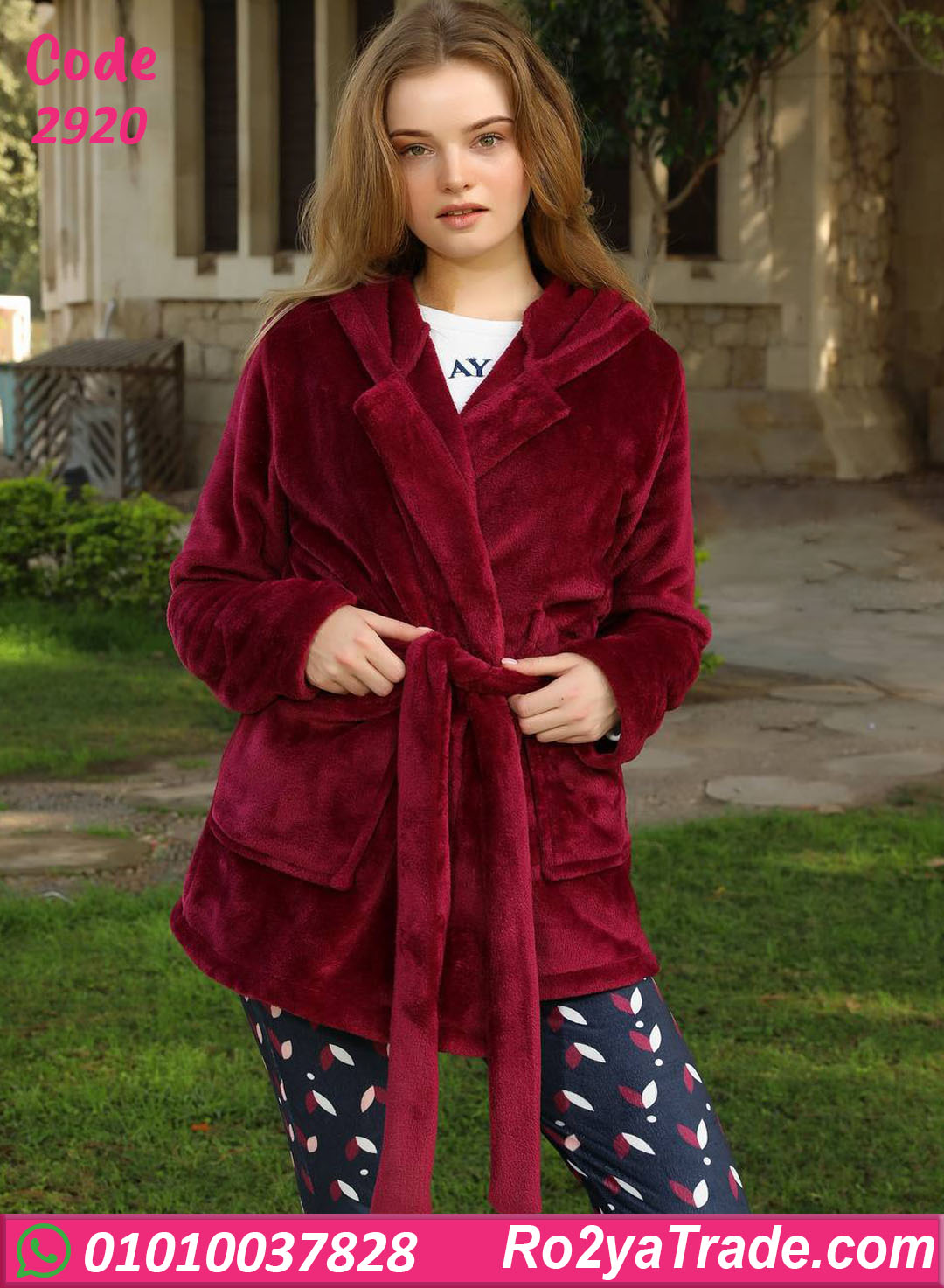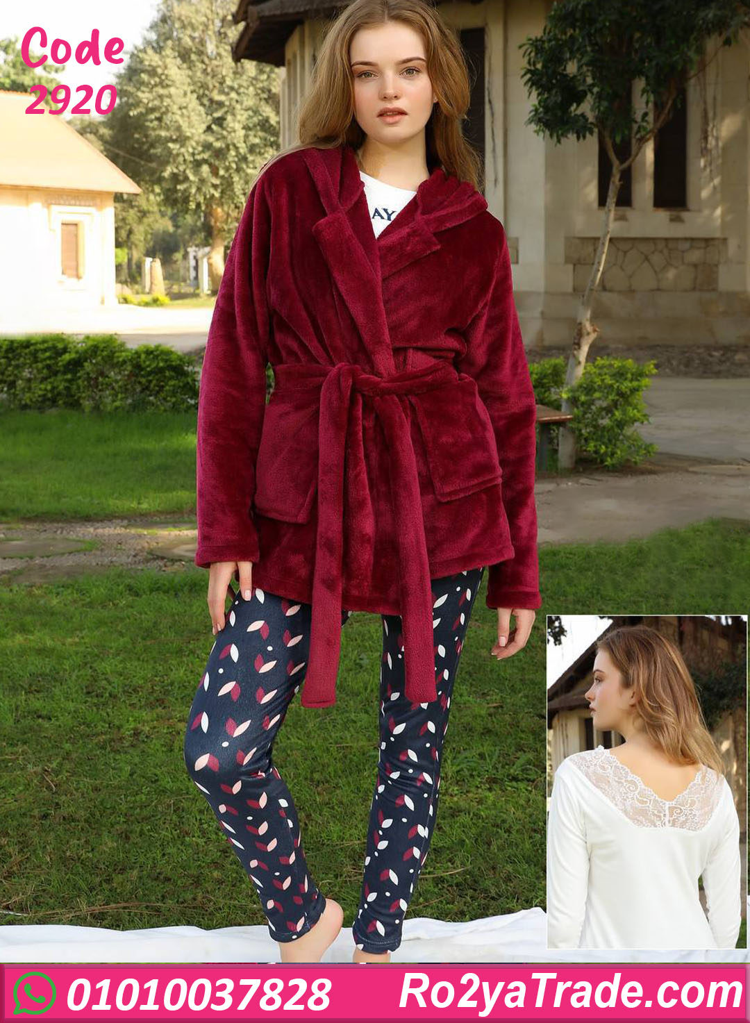 بيجامة شتوي حريمي موديل 2920 اختيار مثالي لأيام الشتاء الباردة. التصميم مكوّن من روب قطيفة دافي بقبعة وحزام لضبط المقاس، مع تيشيرت بلمسة دانتيل ناعمة من الضهر، وبنطلون بطبعة مميزة يدي شكل أنيق وعملي الخامة ناعمة على الجسم وتوفّر دفا عالي من غير أي إحساس بالتقل، والطقم مريح وسهل اللبس ومناسب للاستخدام اليومي داخل البيت.