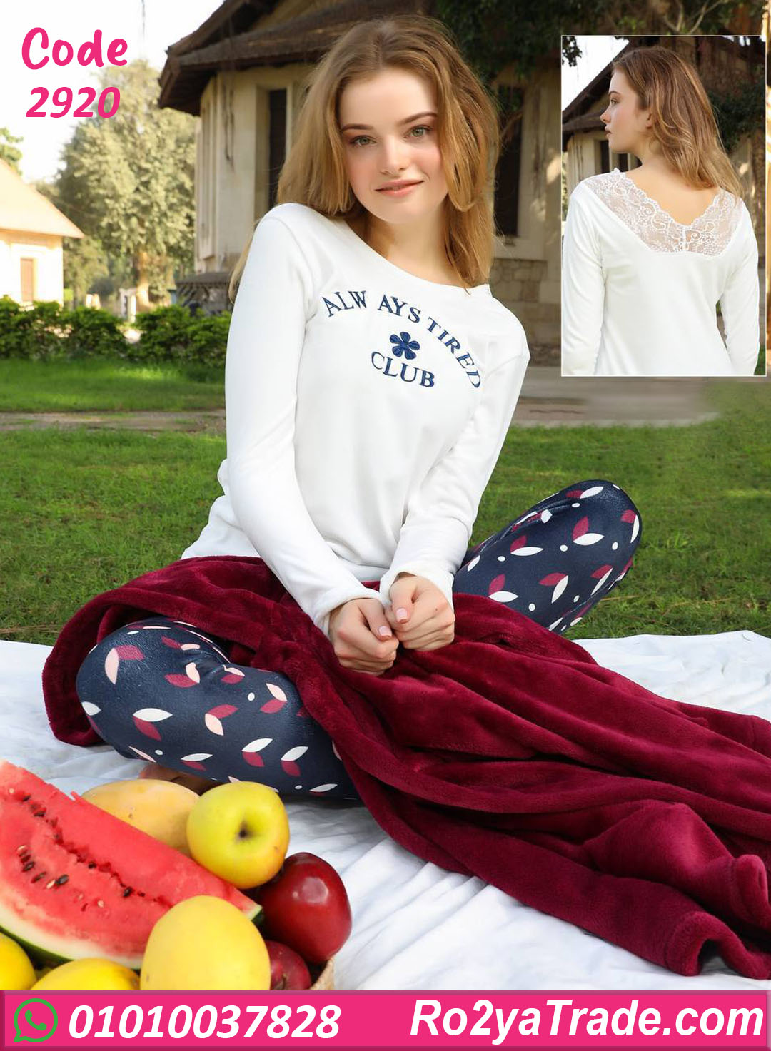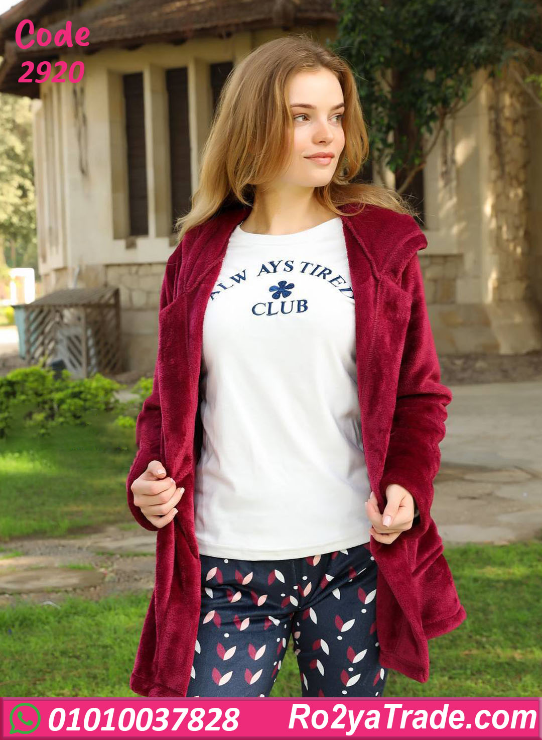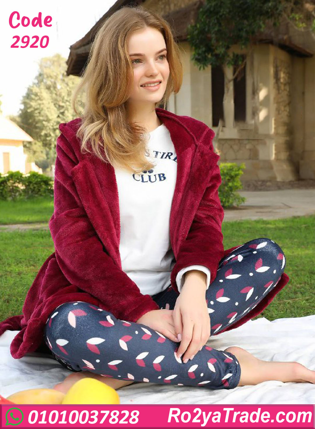 بيجامة شتوي حريمي موديل 2920 اختيار مثالي لأيام الشتاء الباردة. التصميم مكوّن من روب قطيفة دافي بقبعة وحزام لضبط المقاس، مع تيشيرت بلمسة دانتيل ناعمة من الضهر، وبنطلون بطبعة مميزة يدي شكل أنيق وعملي الخامة ناعمة على الجسم وتوفّر دفا عالي من غير أي إحساس بالتقل، والطقم مريح وسهل اللبس ومناسب للاستخدام اليومي داخل البيت.