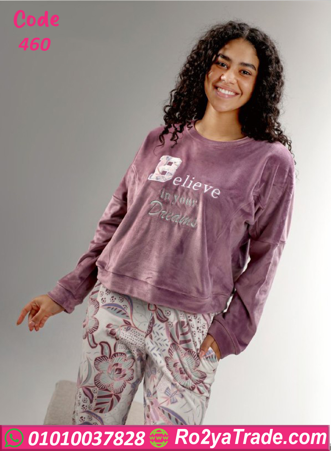 بيجامة شتوي حريمي بتصميم هادي وشيك، البلوزة خامتها تقيلة وناعمة وعليها كتابة أنيقة،