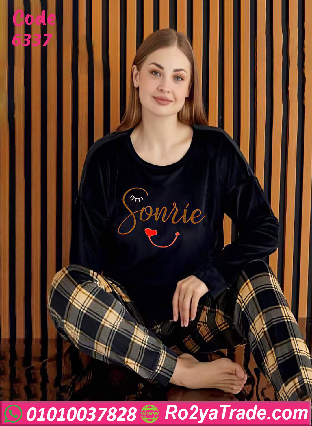 بيجامة شتوي أنيقة بخامة فخمة ودفا مضمون، بلون اسود مع بنطلون كاروه جذاب ✨