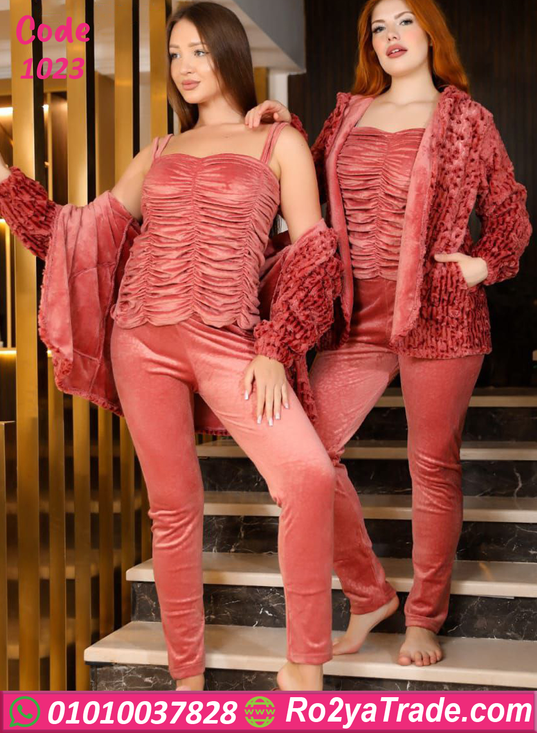 بيجامة حريمي ي 3 قطع ناعمة جدًا بخامة القطيفة الفاخرة مع جاكيت فرو تقيل ودفا فوق الخيال
