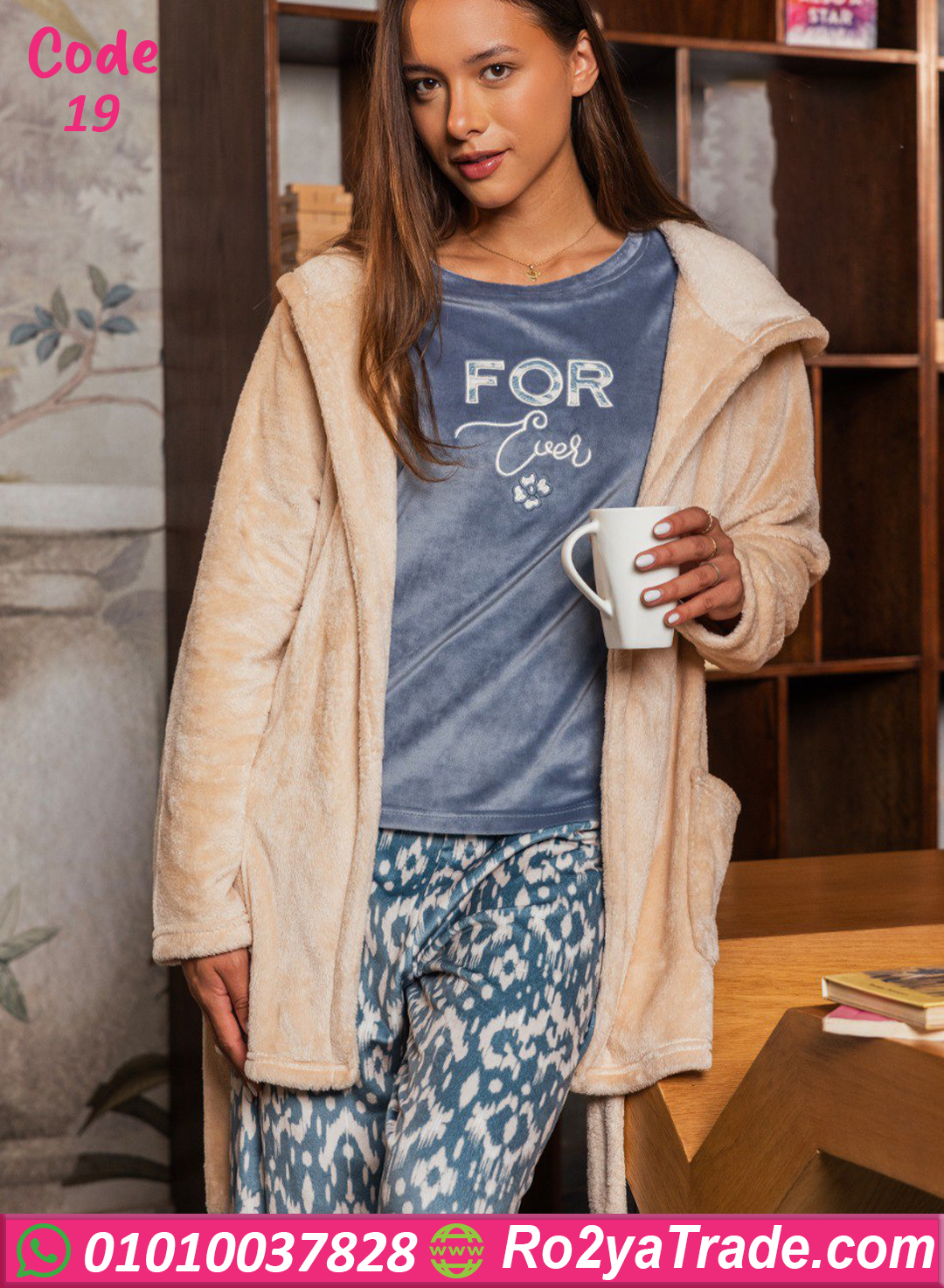 البيجامة مكونة من 3 قطع فخمة جدًا: تيشيرت قطيفة لونه رمادي غامق مطرز بكلمة “Forever”، وبنطلون مطبوع بنقشة أنيقة بستايل عصري، ومعاهم روب فرو طويل دافي وشيك جدًا بلون بيج ناعم 🤎