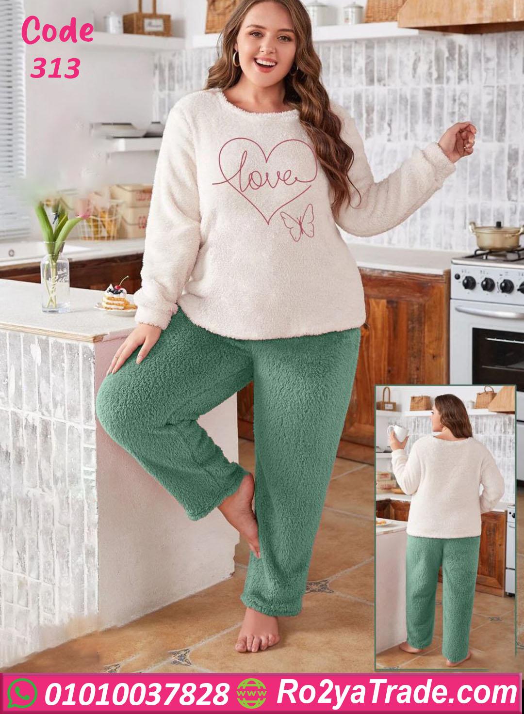 بيجامة شتوي فخمة بخامة فرو ناعمة جدًا تدفيكي في البرد وتدي إحساس راحة طول اليوم. الجزء العلوي بلون أبيض كريمي ناعم عليه طباعة “Love” مع شكل فراشة بسيط يضيف لمسة أنوثة. البنطلون لونه أخضر ثلجي لطيف بخامة فرو سميكة مرنة. تصميم واسع ومريح، مناسب للبيت والسهرات الشتوية المريحة. الموديل بيجمع بين الدفا، النعومة، والجمال في نفس الوقت. خامة قوية وسهلة الغسيل ومابتكش ولا بتغير لونها بعد الغسيل.