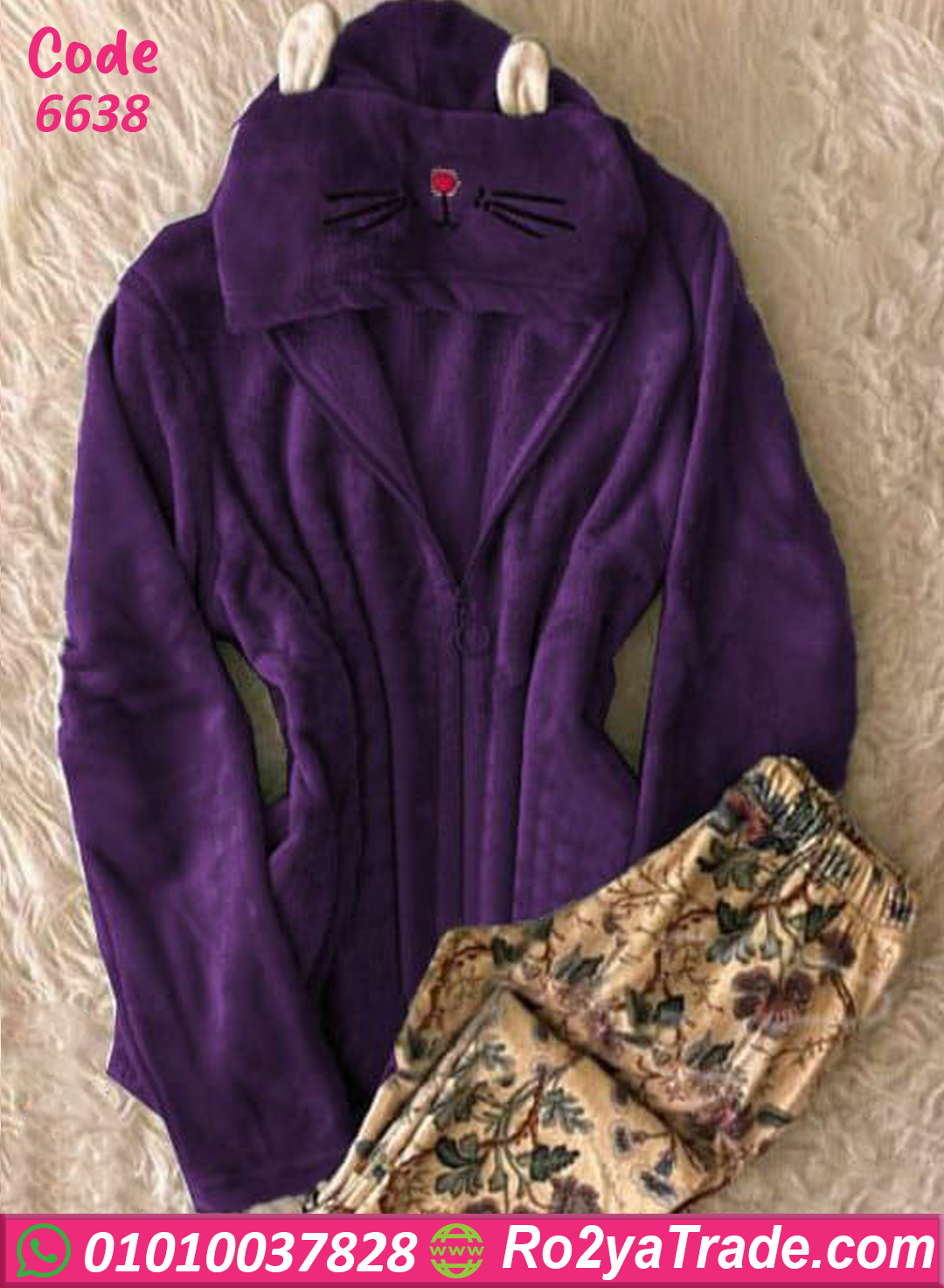 جاكيت قطيفة ناعم جدًا بسوستة أمامية وغطاء رأس بأذنين مطرزين بشكل لذيذ، والبنطلون منقوش نقشة دافئة ومميزة تضيف لمسة أنوثة ودفا.