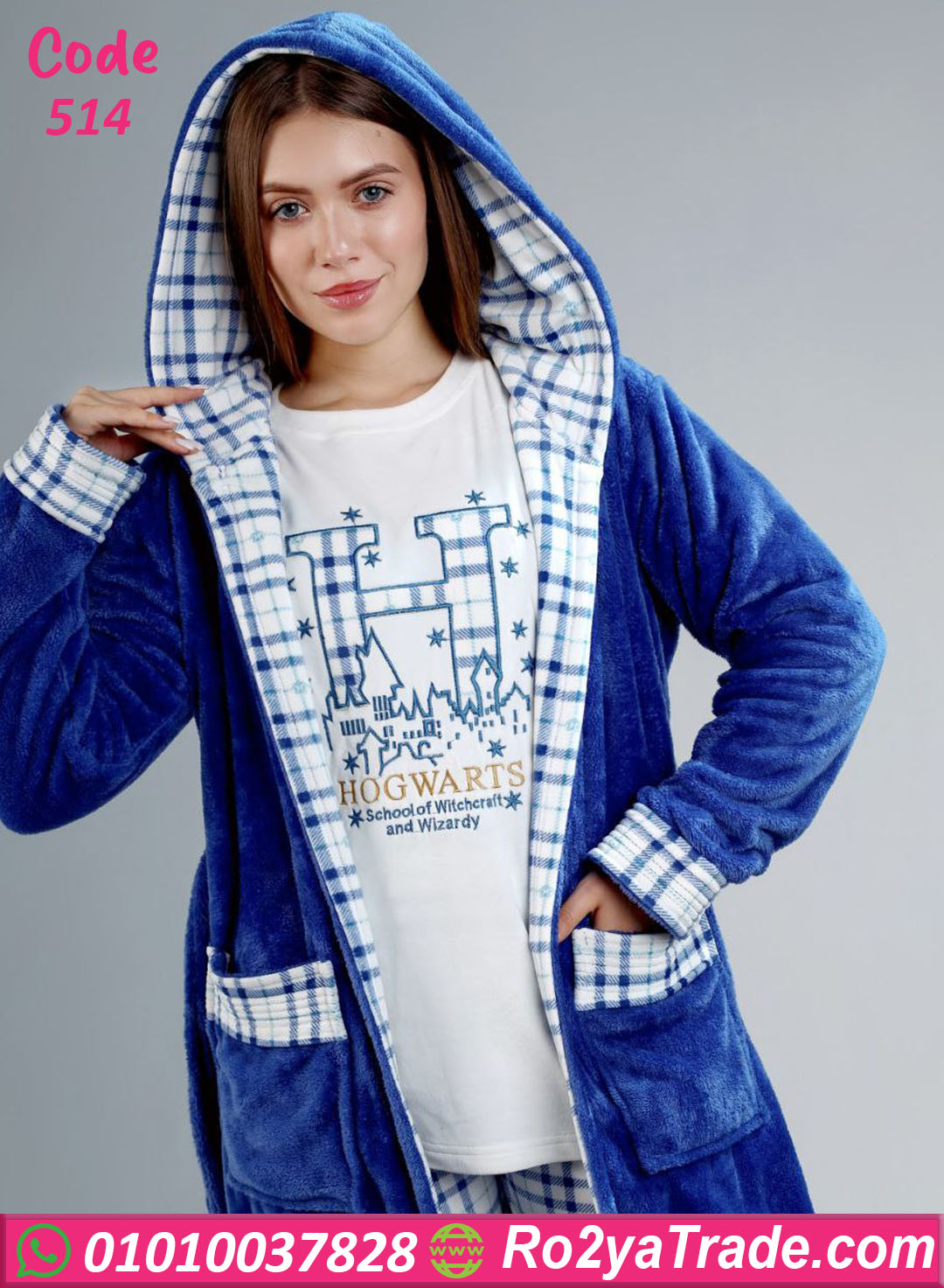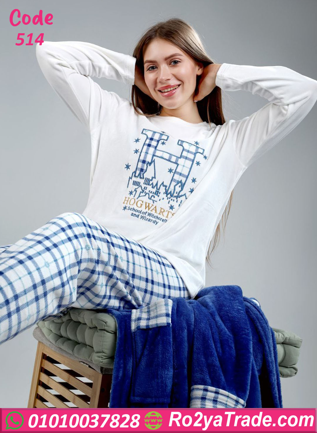 الطقم بيتكوّن من توب أبيض بنقشة Hogwarts المطرزة وبنطلون كارو أزرق في أبيض، وكمان روب بنفس التصميم يكمل الشياكة.