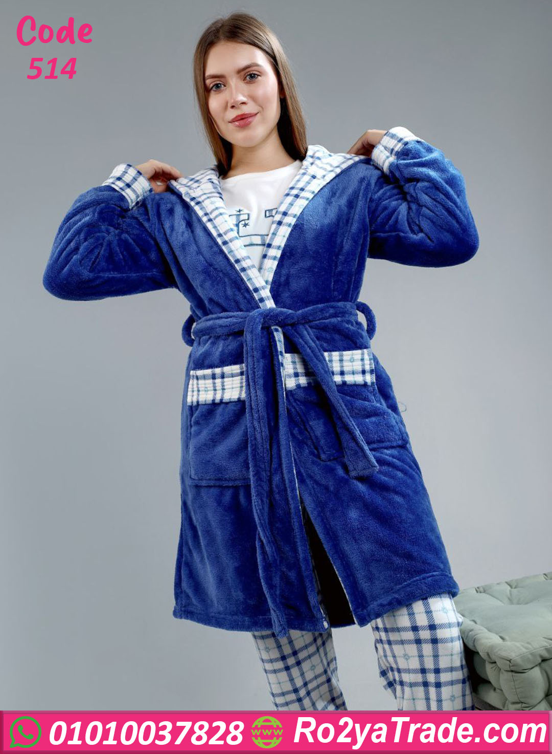 بيجامة شتوي قطيفة كارو أزرق – كود 514