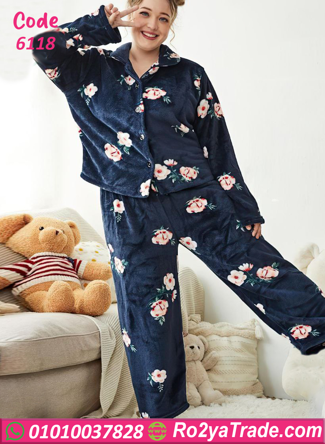 بيجامة شتوي حريمي خامة قطيفة ناعمة جدًا بلون كحلي مشجر بورود، بتصميم واسع ومريح مثالي لأجواء الشتاء.