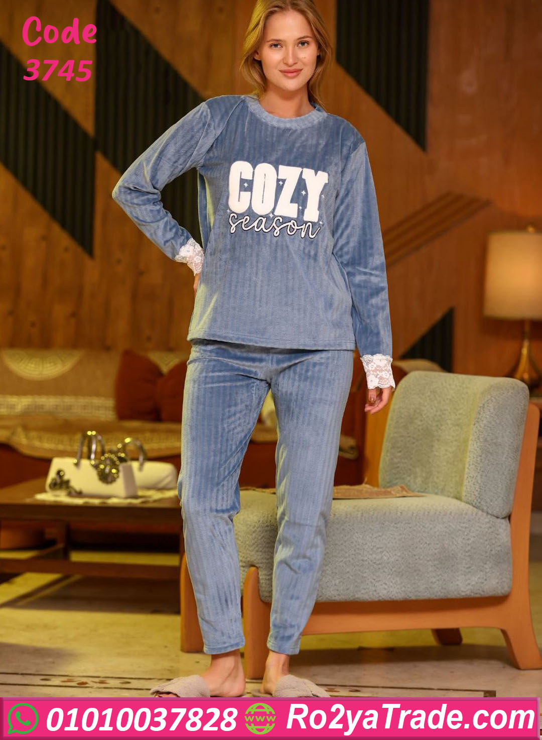بيجامة حريمي شتوي ناعمة جدا من القطيفة بتطريز “Cozy Season” مع لمسة دانتيل شيك على الكم.