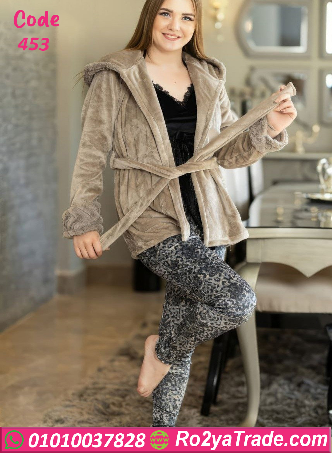 بيجامة شتوي قطيفة شيك ومختلفة مكونة من توب قطيفة ناعم بدانتيل، عليه طبقة تول لامعة ستايل سواريه، وبنطلون خامته دافيه بنقشة شتوية مميزة. ومعاهم روب قطيفة خامة تقيلة بيدفي جدًا ومناسب للبيت في البرد. الموديل عملي ومريح وشكله أنيق لكل البنات اللي بتحب تجمع بين الدفا والشياكة، والخامة ممتازة مش بتكش ولا بتوبر وسهلة الغسيل.