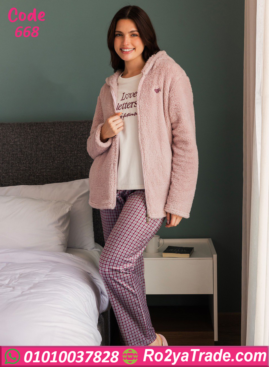 بيجامة شتوي بخامة قطيفة تيدي ناعمة جدًا، بتضم بلوزة بسيطة بطباعة ناعمة وبنطلون مربعات شيك مع جاكيت كاب فرو دافي جدًا.