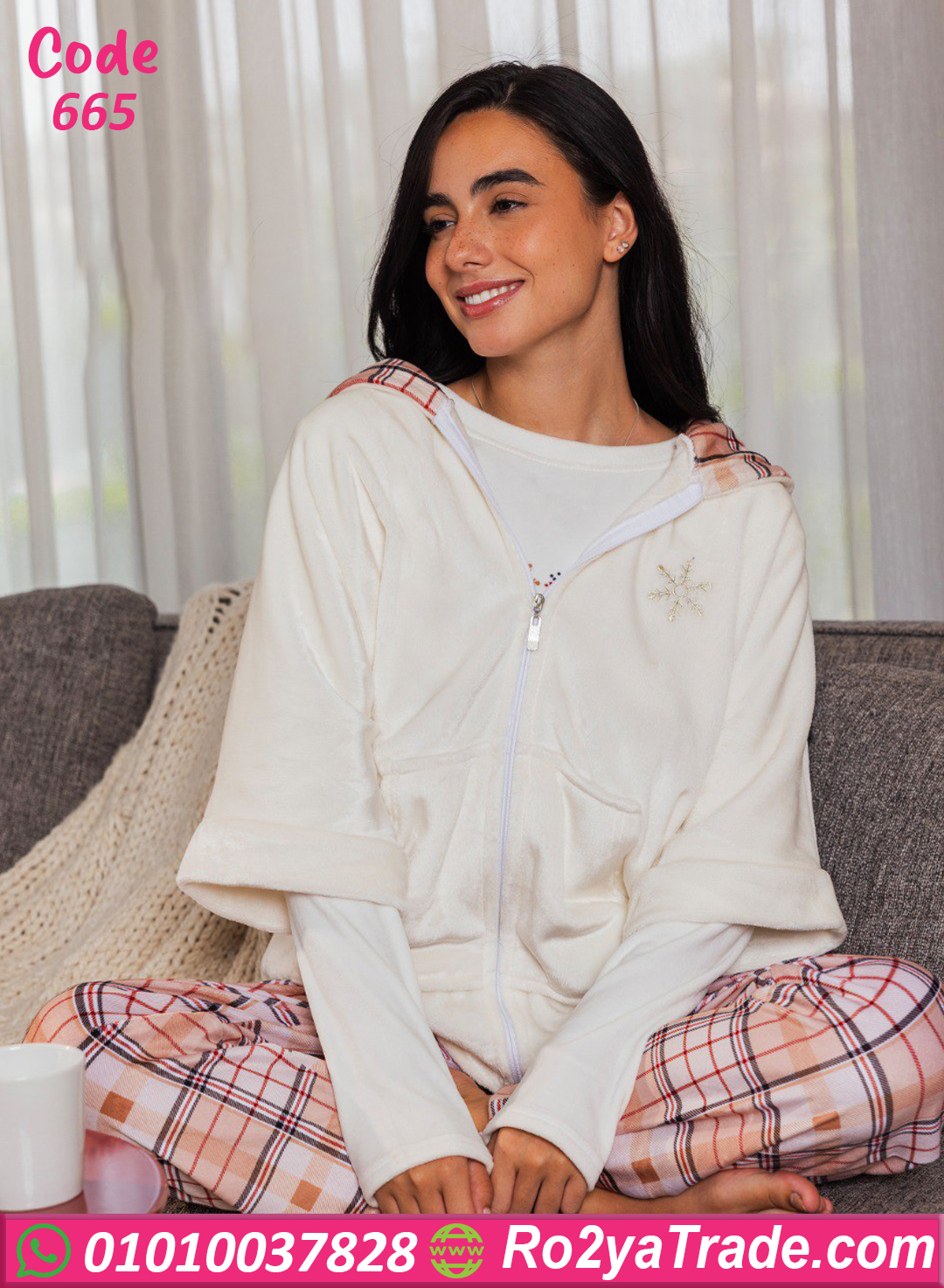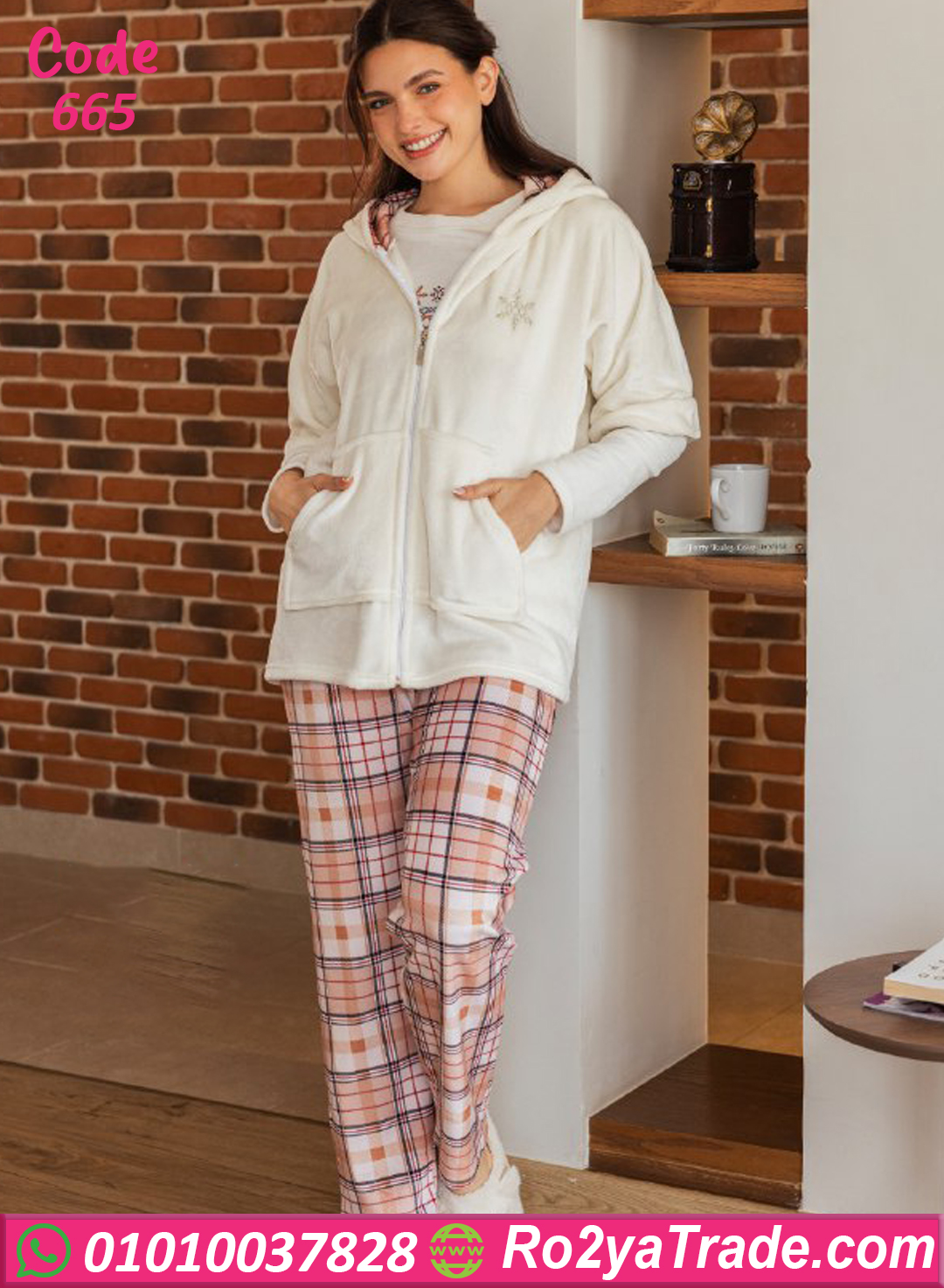 بيجامة شتوي ناعمة جدًا بخامة قطيفة سوفت ودافئة، بتضم بلوزة طويلة بنقشة شيك وبنطلون مربعات مع كاب فرو أنيق.