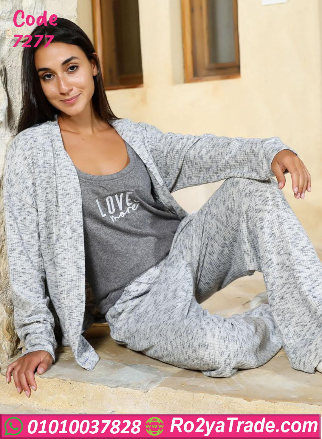 بيجامة شتوي ناعمة جدًا مصممة بخامة مريحة ودفاية تناسب ليالي الشتاء الباردة. الجزء العلوي توب بلون رمادي بسيط وعليه كتابة Love More، ومعاه كارديجان بنفس اللون المنقّط الأنيق يضيف لمسة رقي ونعومة. البنطلون واسع بخامة مرنة ومريحة في اللبس والحركة، مناسب للبيت أو حتى قعدة شاي دافية بالليل. الموديل عملي وأنيق في نفس الوقت، بخياطة متقنة ومظهر شيك يخليكي دايمًا مرتاحة وأنيقة في بيتك.