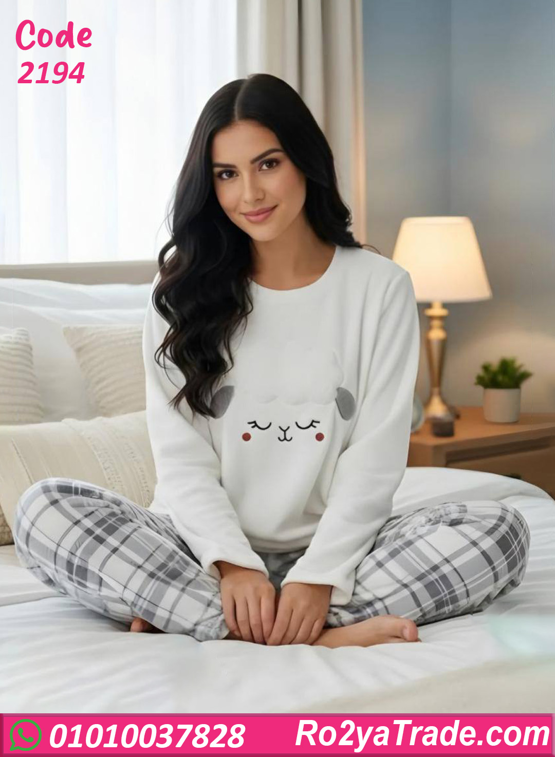 بيجامة شتوي كود 2194 مكونة من بلوزة كم طويل بنقشة كيوت وبنطلون كاروه مريح، الخامة ناعمة