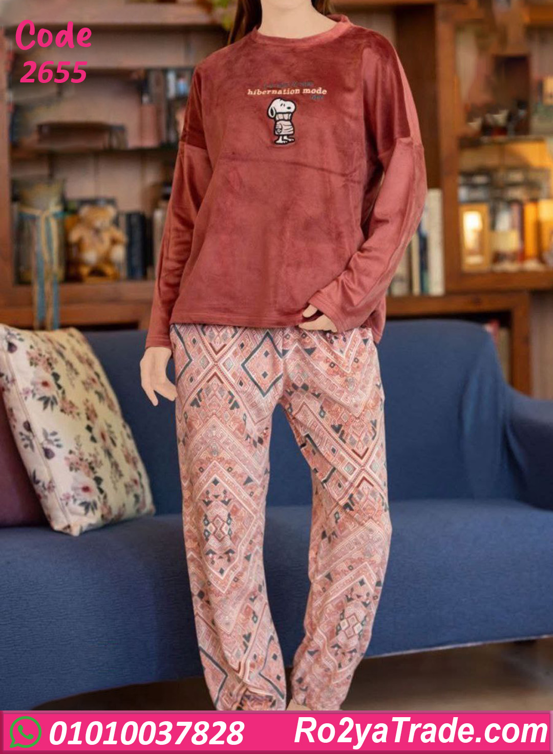بيجامة شتوي حريمي مريحة وشيك، خامتها ناعمة وبتدي إحساس دفا ممتاز، تصميم عصري بطباعة لطيفة يناسب اللبس اليومي في البيت،