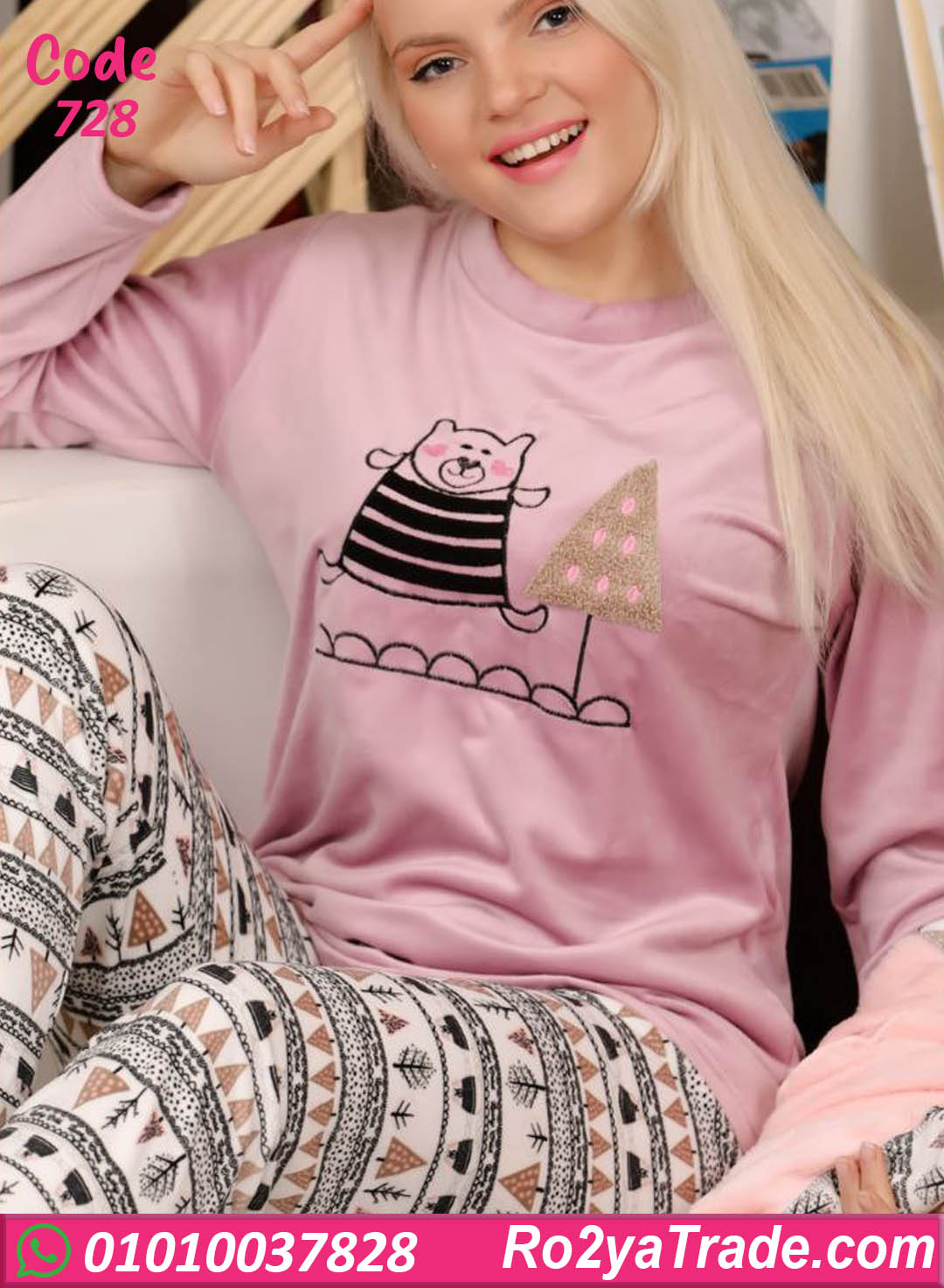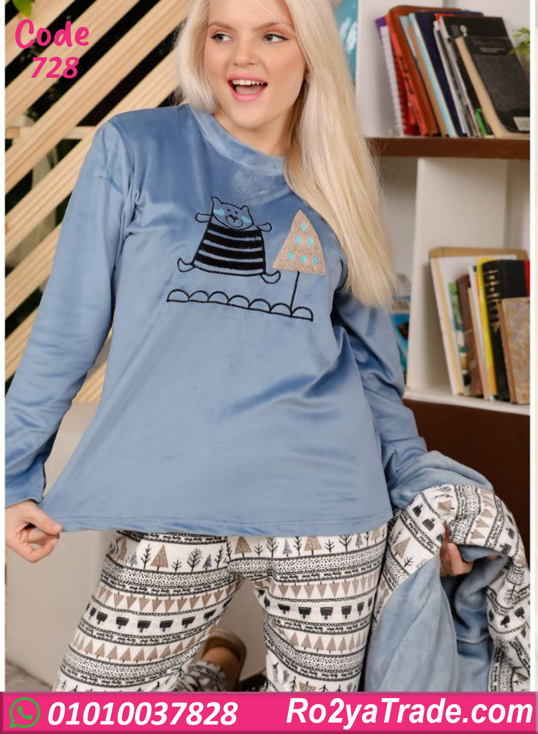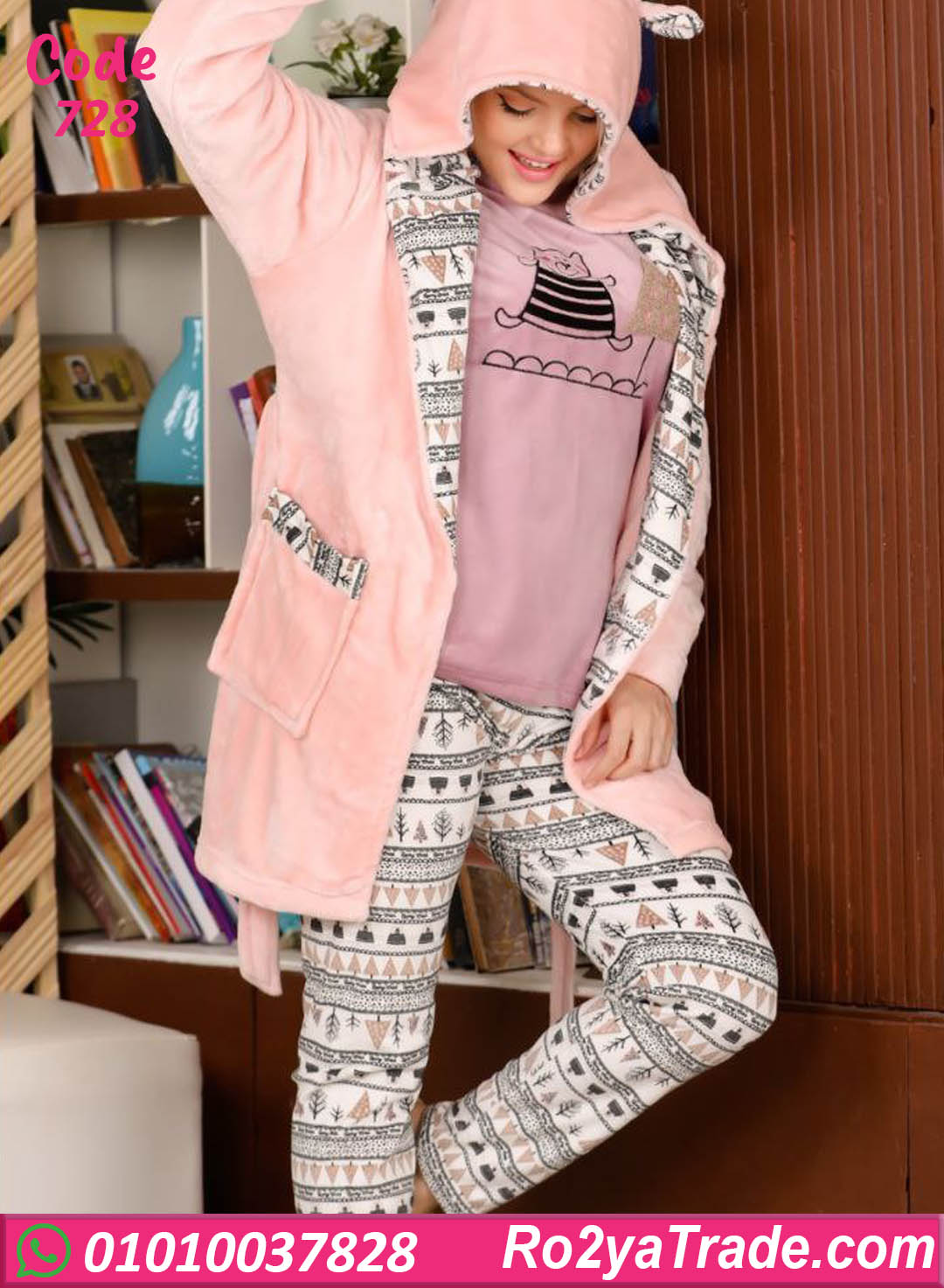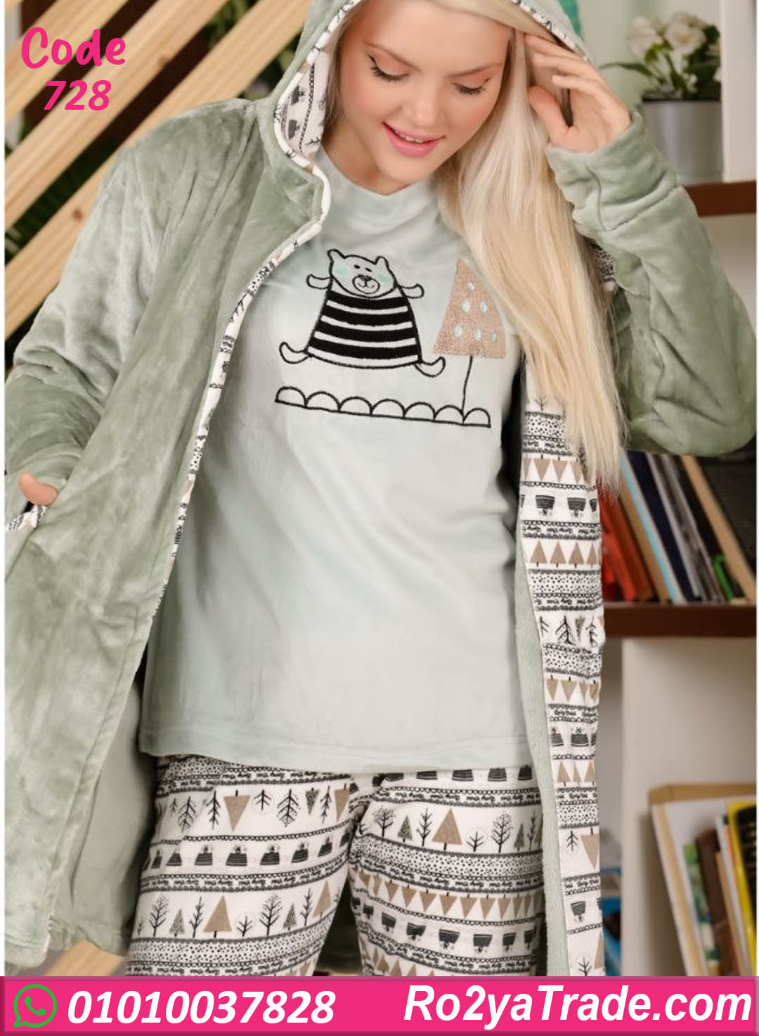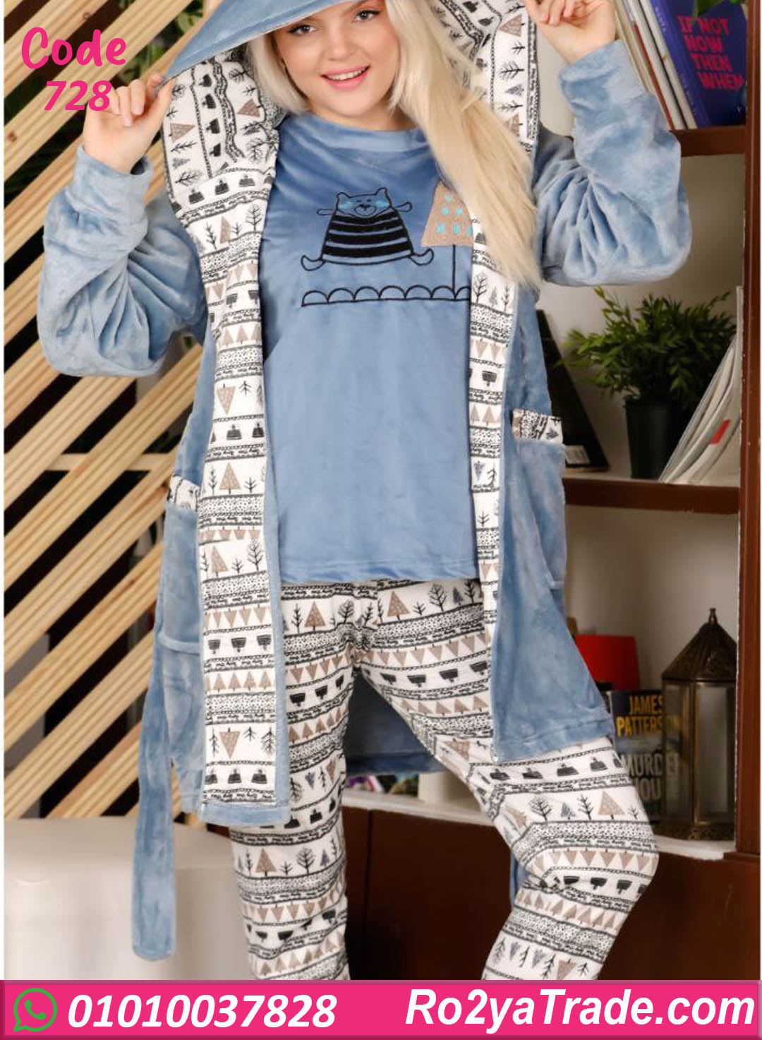 بيجامة شتوي حريمي أنيقة بتصميم مميز يجمع بين الشياكة والراحة، الطقم مكوّن من تيشيرت وبنطلون مع روب شتوي بخامة تقيلة وناعمة.