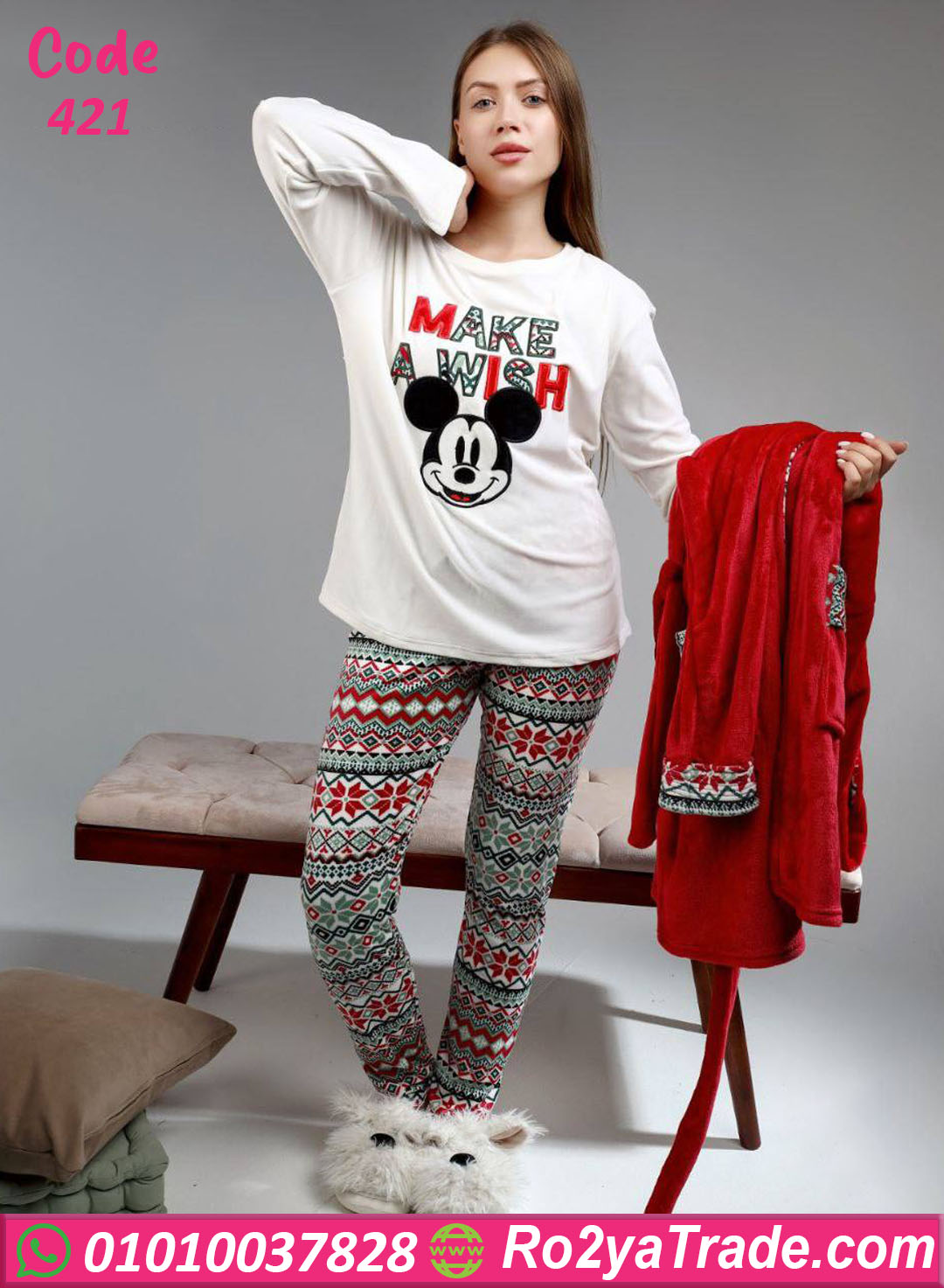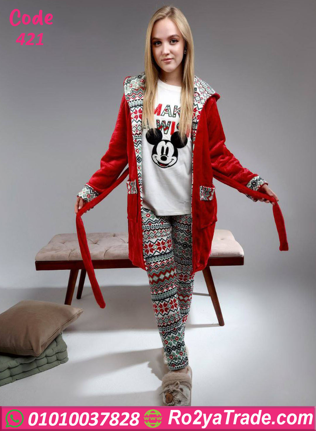 البيجامة بتتكون من توب أبيض مطبوع عليه تصميم ميكي ماوس اللطيف، مع بنطلون بنقشة شتوية مميزة، وكمان روب قطيفة أحمر بنفس التفاصيل عشان لوك كريسماس دافي ومبهج.