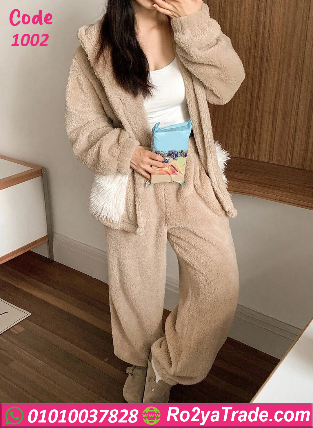 الخامة ناعمة جدًا على الجسم وكأنك لابسة بطانية دافية! التصميم أنثوي ومميز، جاكت فرو ناعم بلون بيچ فاتح مع أذنين على الكابيشون لمسة كيوت بتخلي الشكل كله دفا وأناقة. البنطلون واسع بخامة مطاطة مريحة جدًا للحركة في البيت أو وقت الاسترخاء.