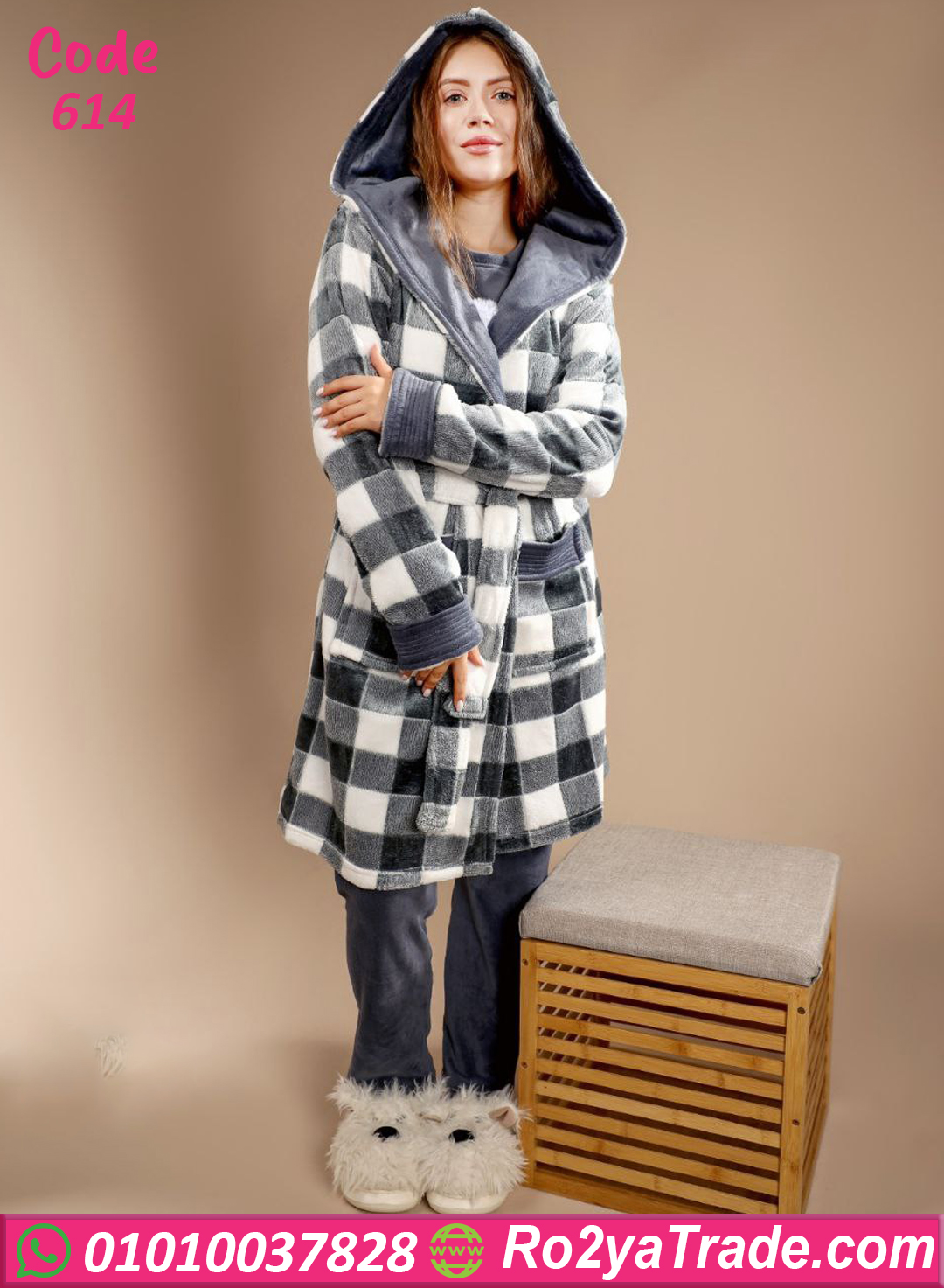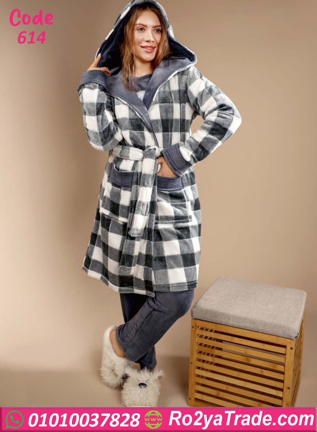 البيجامة مصنوعة من خامة قطيفة سوفت مريحة جدًا على الجسم، وبتيجي بتصميم كلاسيك شيك مكوّن من توب سادة مطبوع وبنطلون ساده بلون متناسق، ومعاه روب كاروه بيكمل اللوك بإطلالة أنيقة ومحتشمة في نفس الوقت 👌
