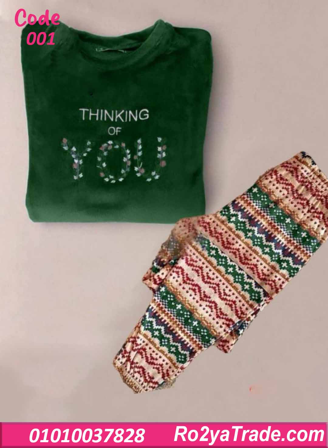 X wearكود 001 اختيار مثالي لأجواء الشتاء الدافية واللوك المبهج في البيت. التصميم مكون من قطعتين: بلوزة سادة باللون الأخضر بطبعة “THINKING OF YOU” بشكل ناعم ومميز، وبنطلون بنقشة شتوية ملونة بتفاصيل هندسية جذابة بتدي إحساس بالدفا والبهجة في نفس الوقت.