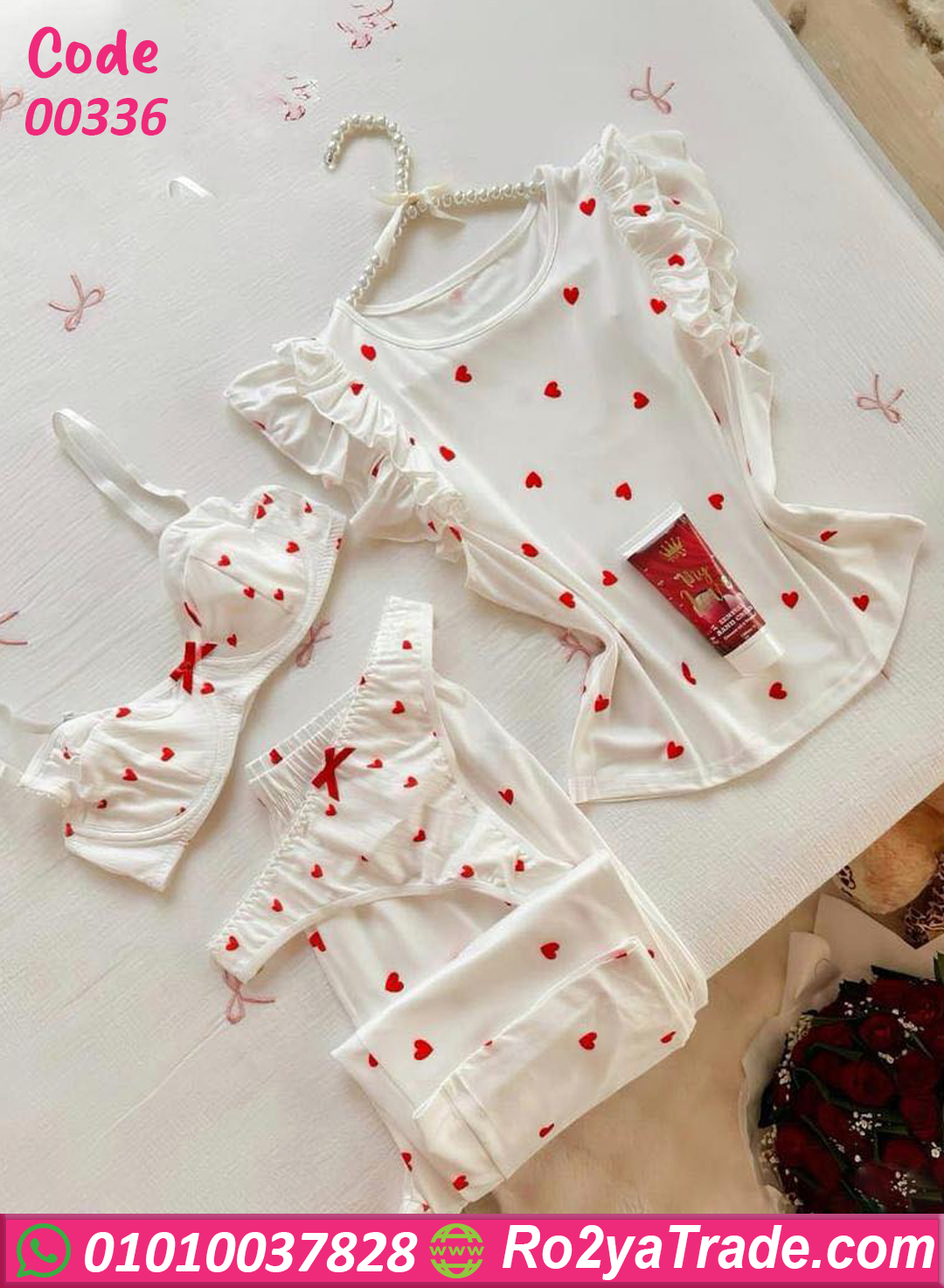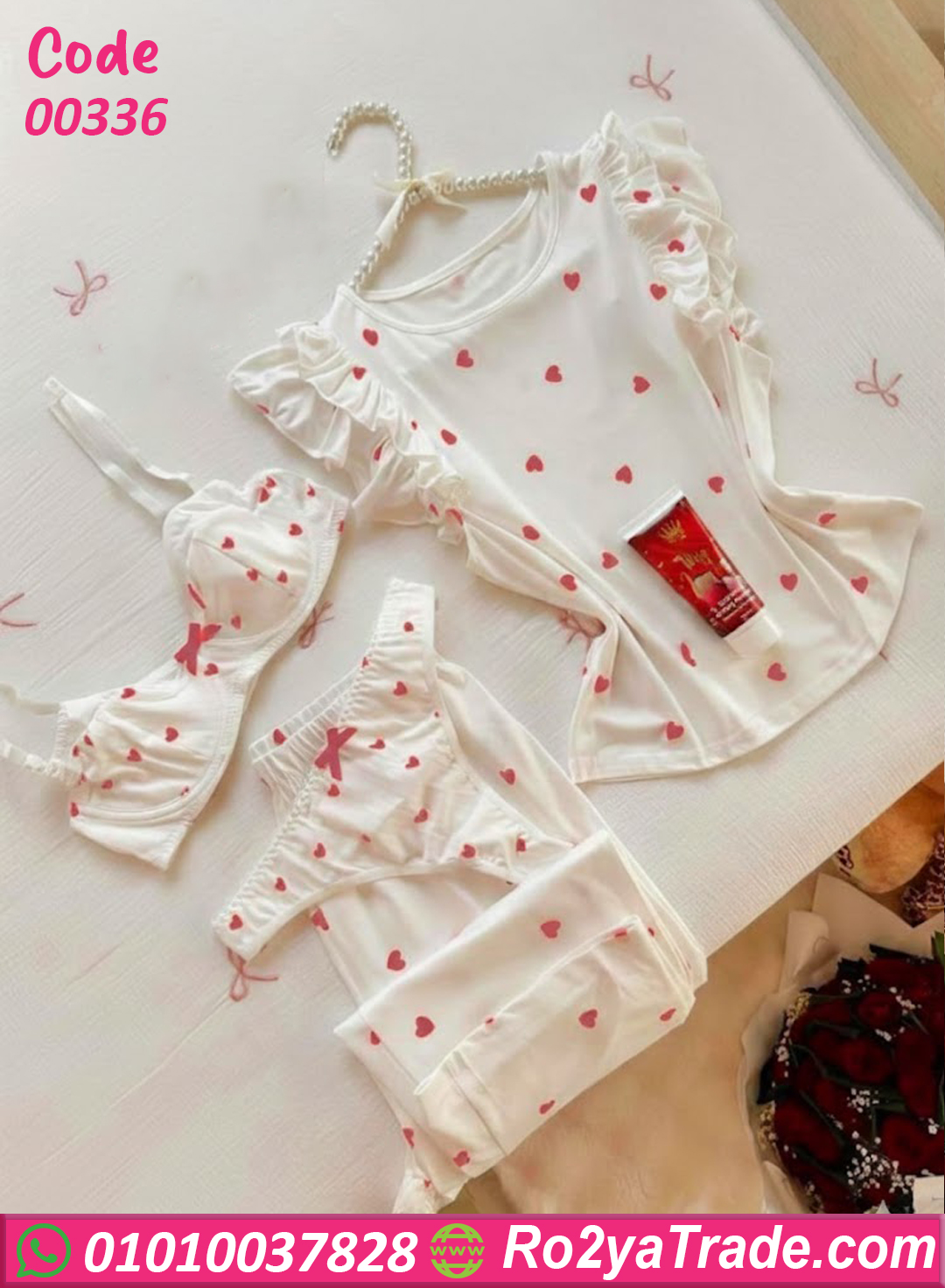 بيجامة صيفي شيك بتصميم ناعم ونقشة قلوب رقيقة تضيف إحساس بالراحة والدلع، شكلها مبهج وخفيف ومناسبة للبيت والنوم في الأيام الحارة.