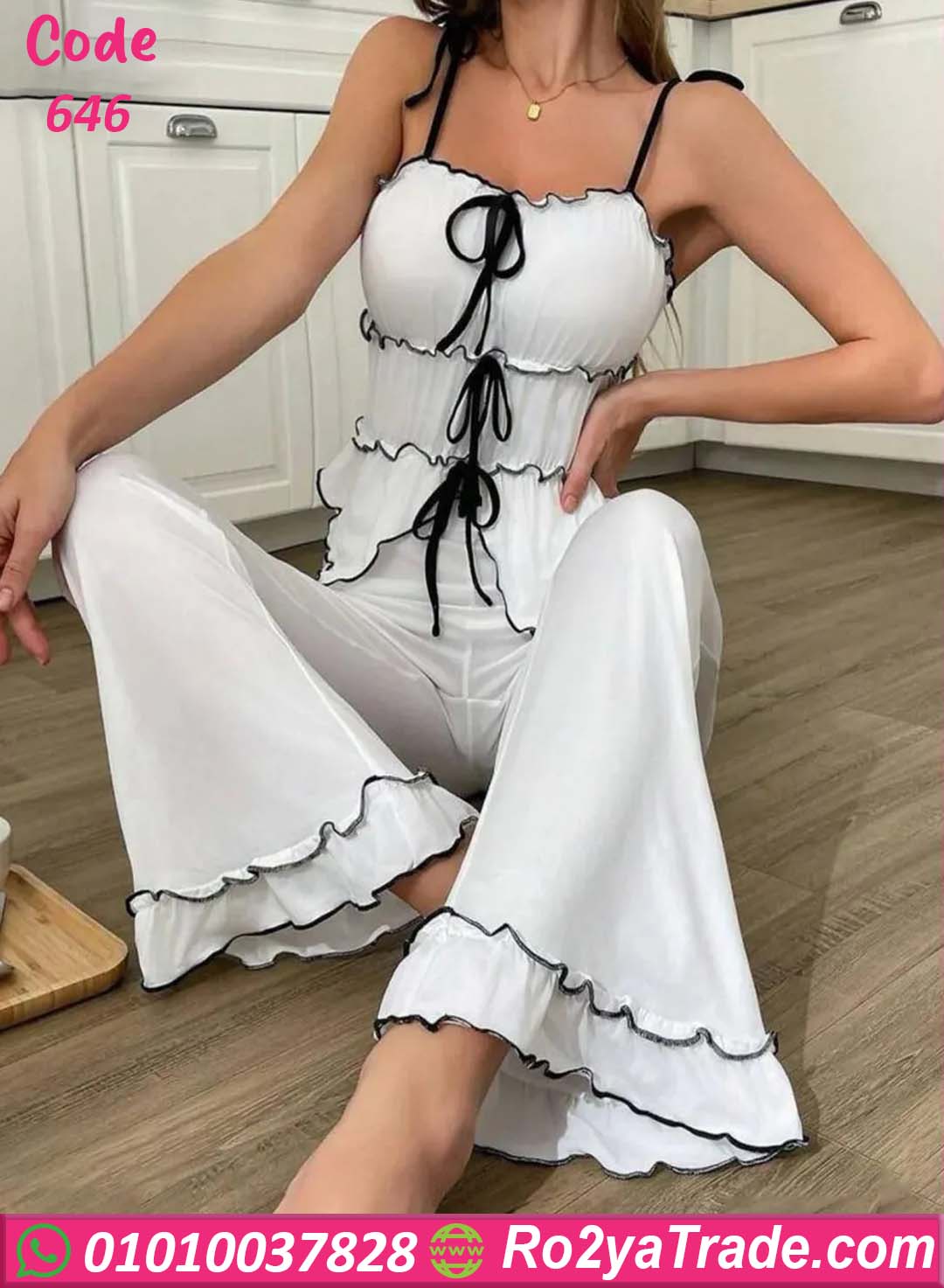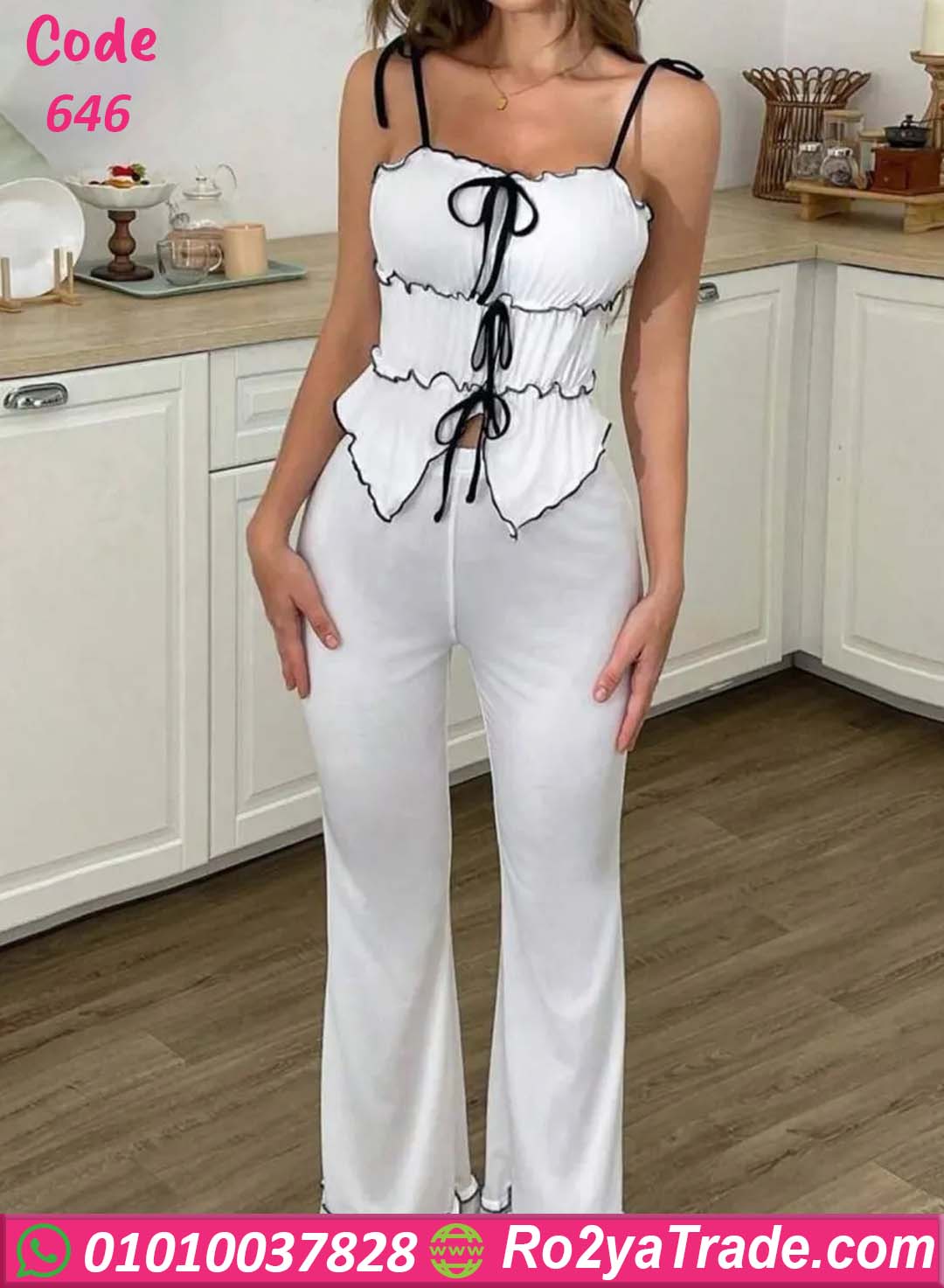 بيجامة حريمي صيفية أنيقة تتكون من توب بحمالات رفيعة مع بنطلون واسع مريح، بتصميم عصري مميز يمنحك إطلالة ناعمة ومريحة داخل المنزل.