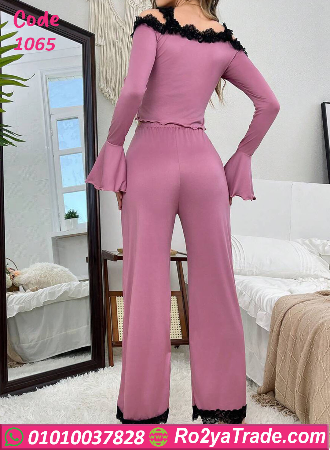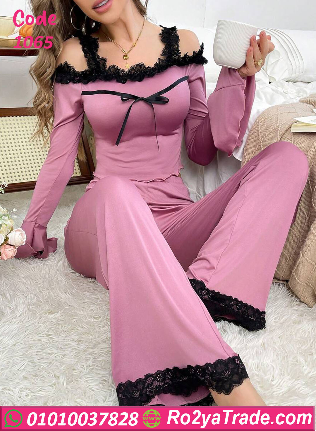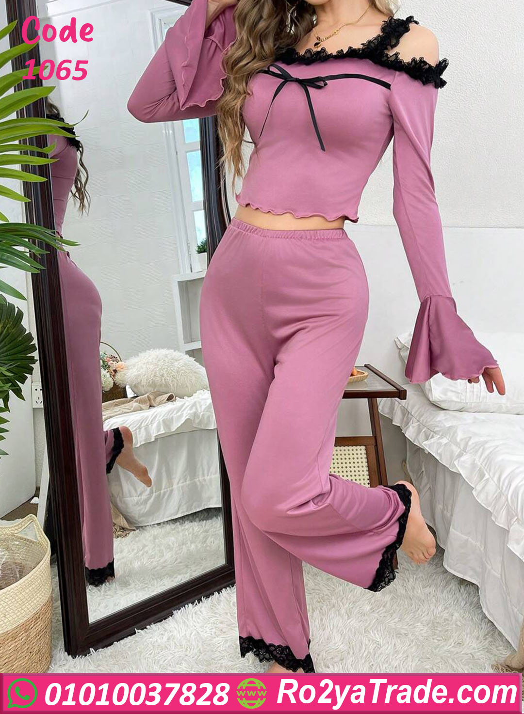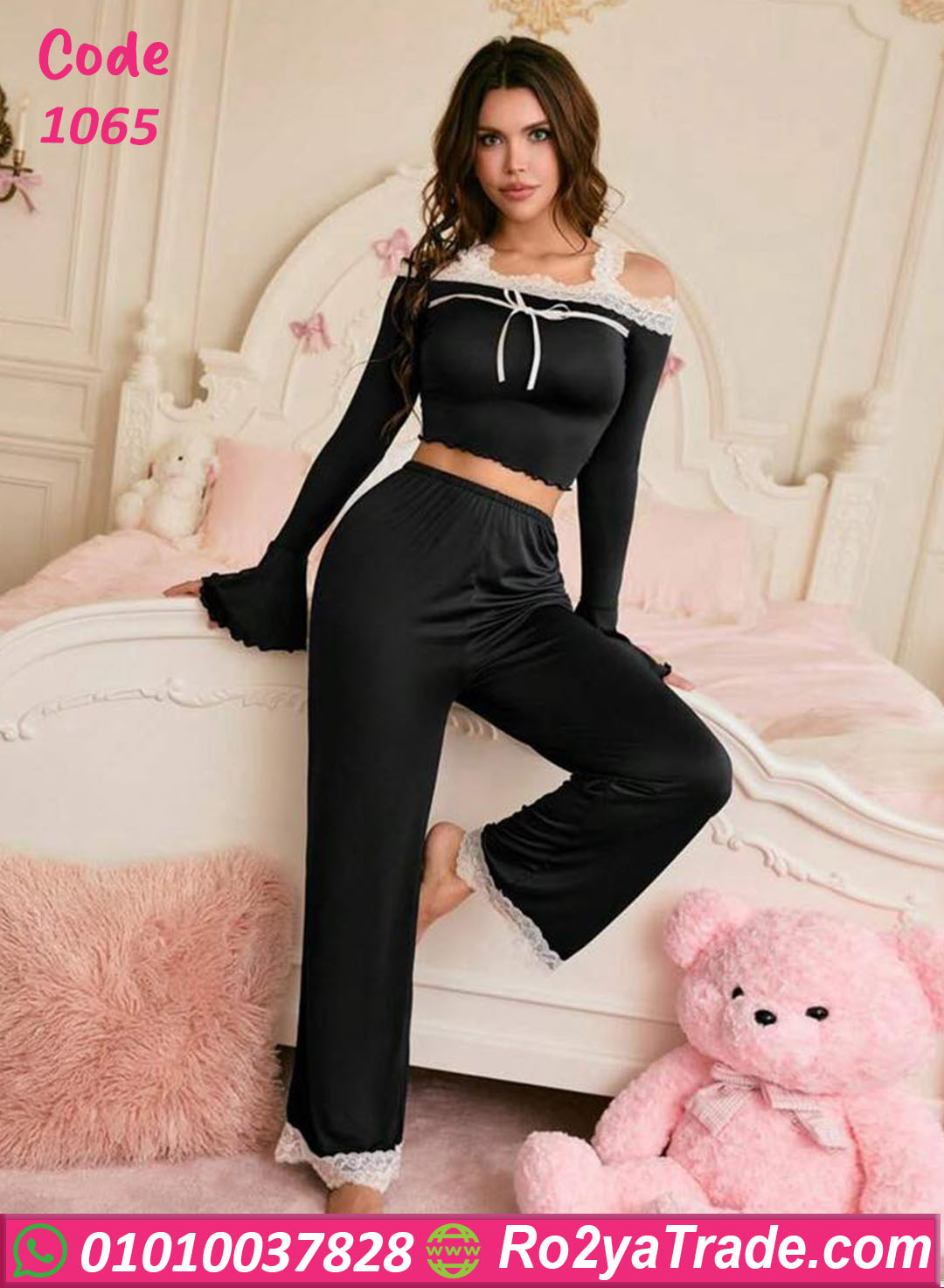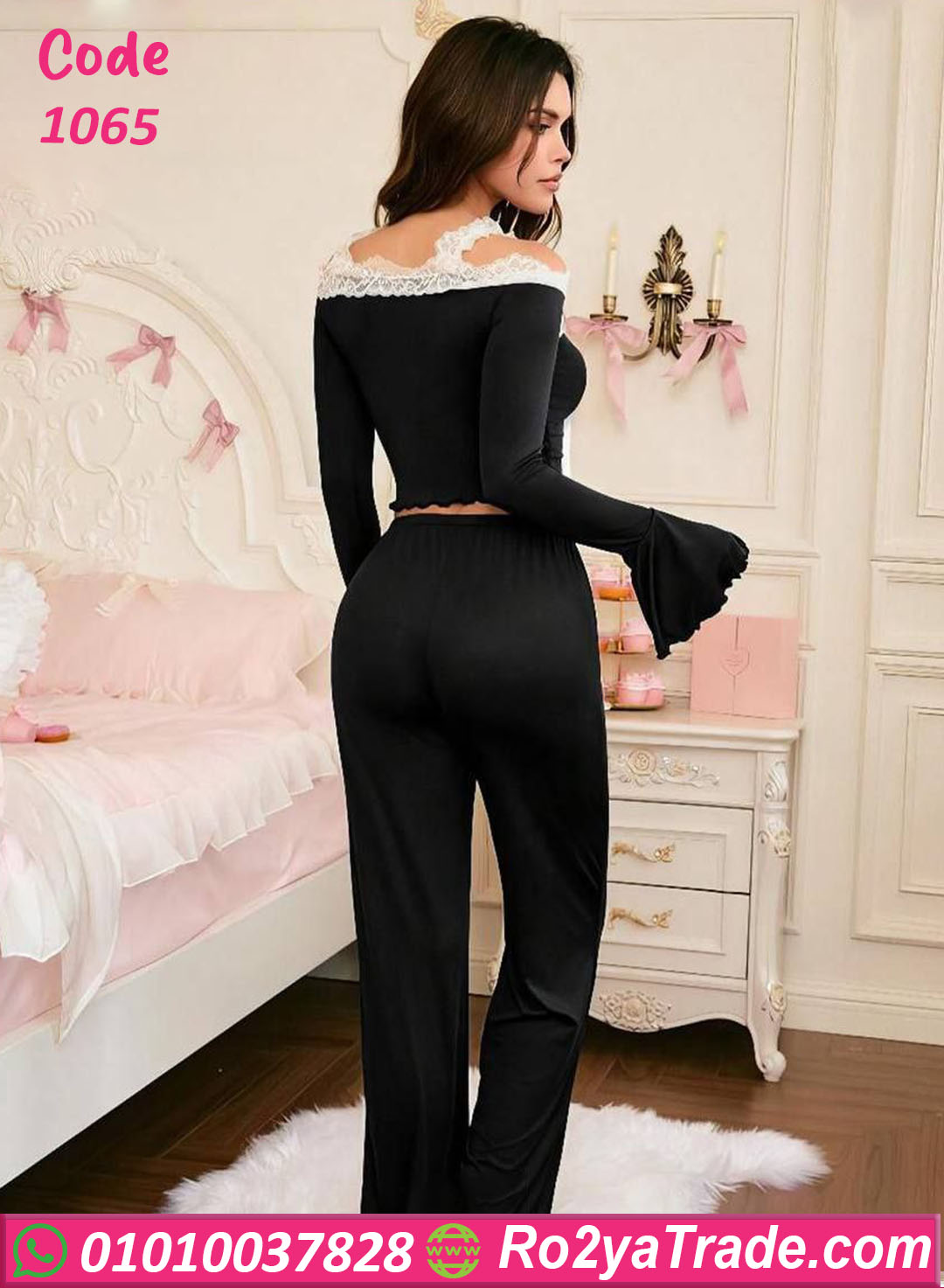 طقم بيجامة صيفي ستريتش بخامة ناعمة على الجسم، بتصميم أوف شولدر أنثوي مع دانتيل شيك عند منطقة الصدر والكُم.