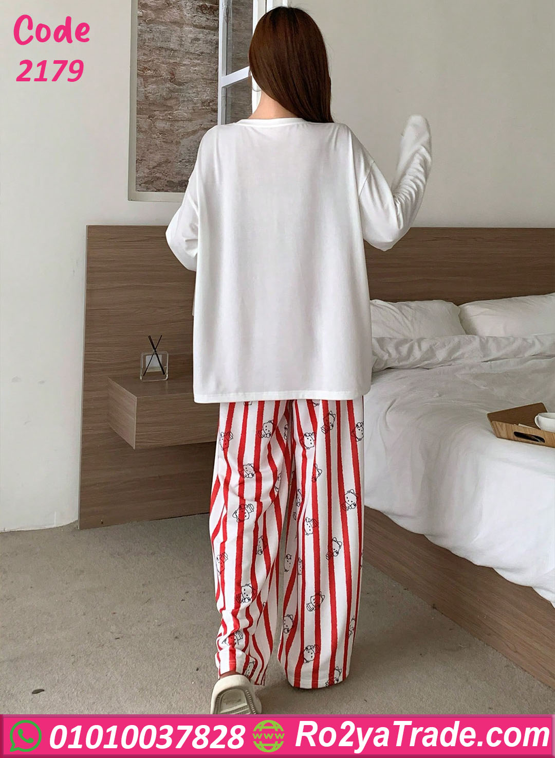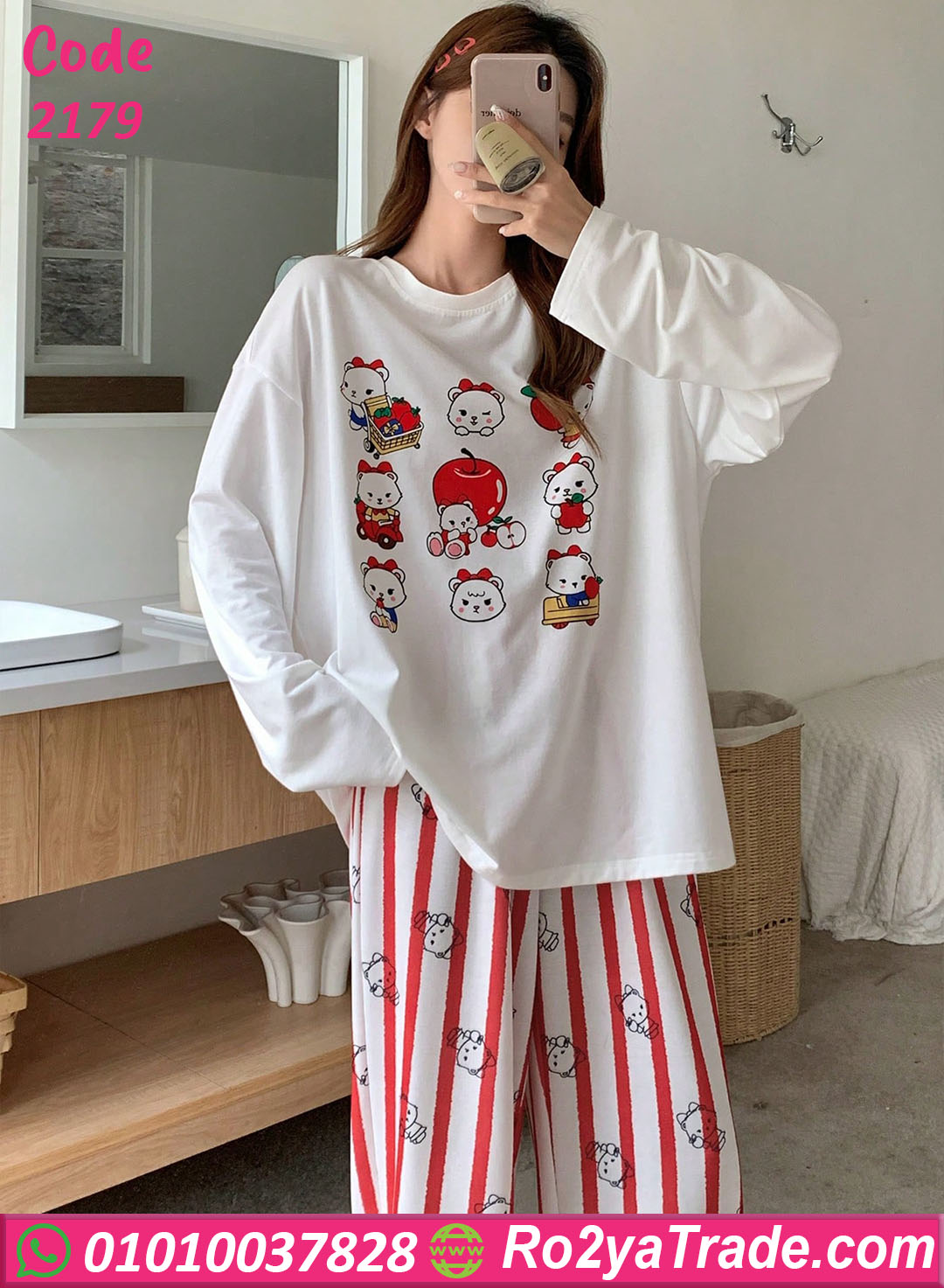بيجامة حريمي صيفي كاجوال بخامة قطن ناعمة خفيفة، تيشيرت أبيض واسع مطبوع وبنطلون مخطط أحمر وأبيض لستايل بناتي لطيف جدًا 💕