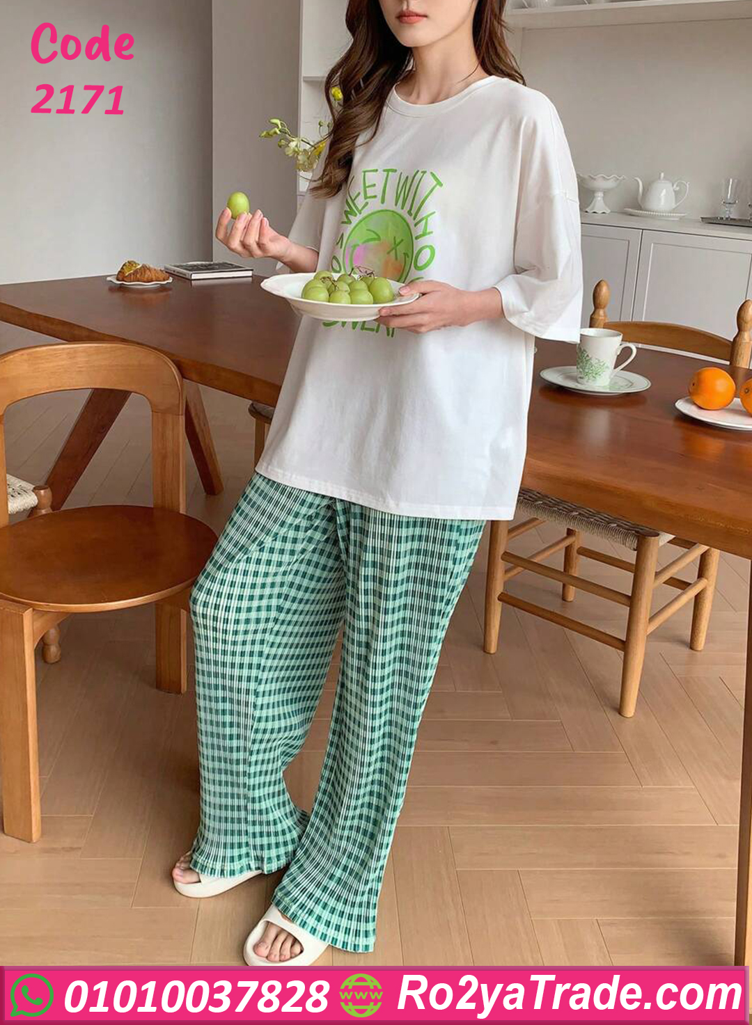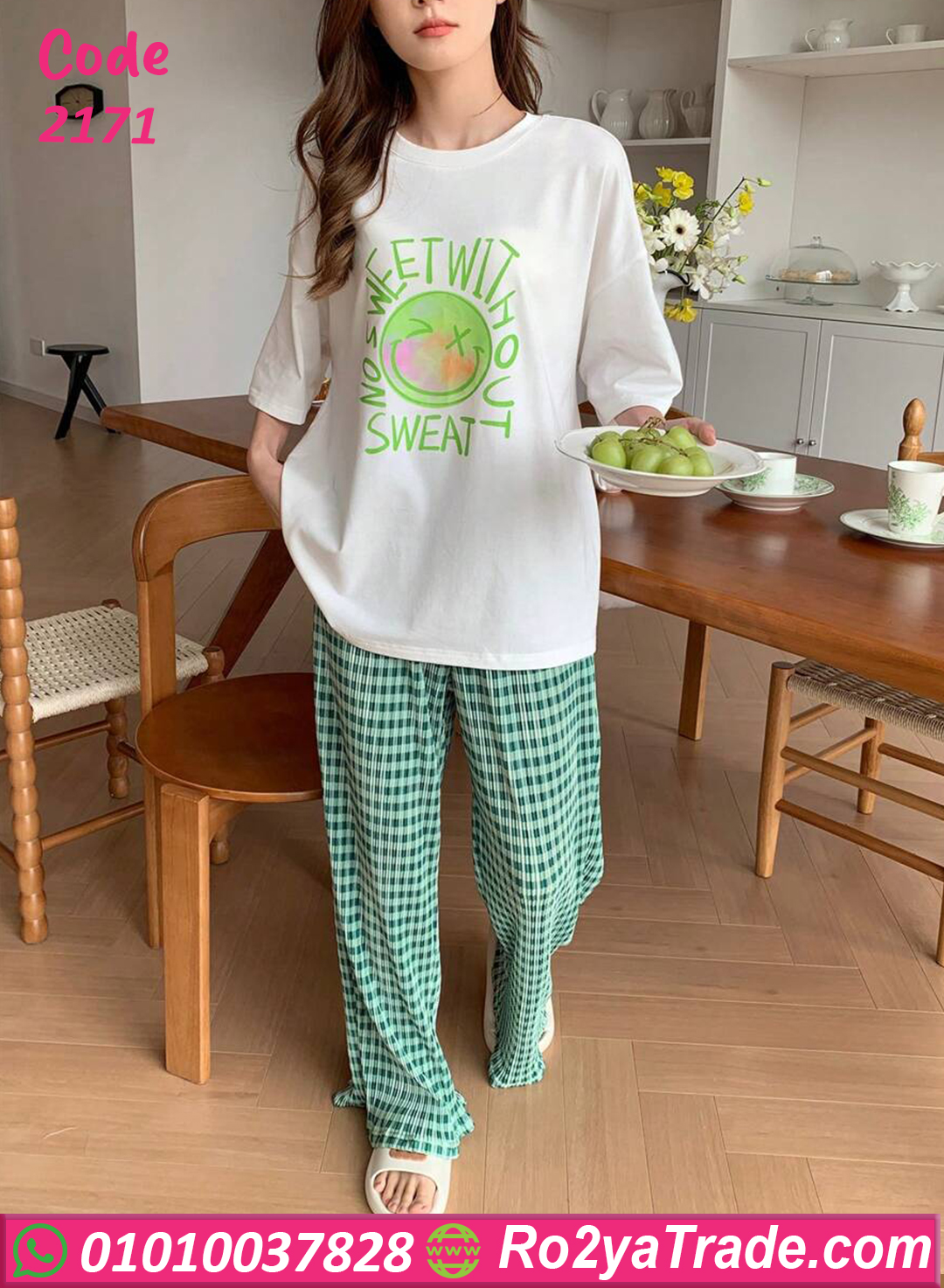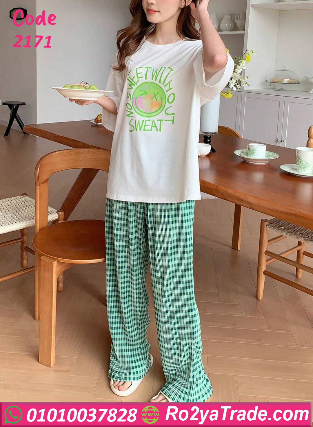 بيجامة كاجوال قطن خفيفة ومريحة جدًا، مكونة من تيشيرت أبيض مطبوع عليه تصميم لذيذ باللون الأخضر، مع بنطلون كاروه أخضر أنيق بخامة ناعمة على البشرة. الموديل ده مناسب للبيت أو المصيف، عملي وفي نفس الوقت شيك، بستايل مميز يدي طابع شبابي عصري. الخامة قطن 100% بتمتص العرق وبتخلي جسمك يتنفس بحرية، وبتحافظ على شكلها بعد الغسيل. الألوان ثابتة ومش بتبهت، والموديل واسع علشان يناسب كل المقاسات وان سايز من 60 لحد 80 كجم.