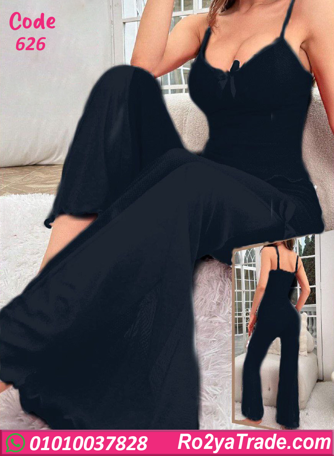 بيجامة صيفي كود 626 بتصميم سادة أنيق مع قصة صدر رقيقة وبنطلون واسع مريح، بتدي حرية حركة