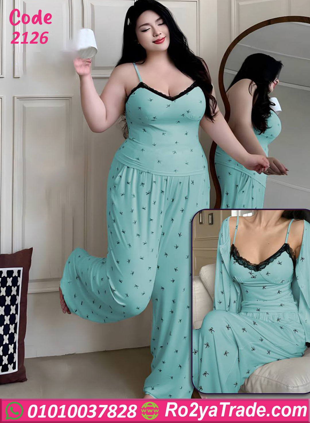 بيجامة مريحة ومودرن في نفس الوقت، مناسبة للبيت أو السهرات الصيفية، بخامة قطن ليكرا بتمط وتاخد شكل الجسم بانسيابية، التصميم فيه جاكت خفيف وتوب حمالة دانتيل أنيق، والبنطلون واسع بستايل مريح وجذاب، هتحسي فيها بالراحة والأنوثة مع كل حركة 🌸