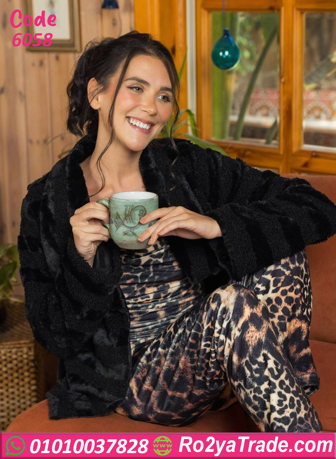 الجاكيت فرو ناعم بخامة فخمة وملمس حريري، تصميمه واسع ومريح وفيه حزام لتحديد الشكل، ومعاه بنطلون ليوبارد ستايل عصري بيوصل لحد الكاحل.