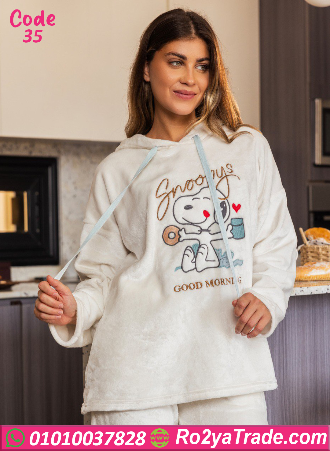 ابدئي صباحك بإحساس دفا وراحة مع بيجامة كود 35 من ALMA ☕❄️ البيجامة فرو ناعم جدًا على الجسم بخامة قطيفة سوفت من جوه ومن بره، بلون أوف وايت أنيق جدًا يناسب كل الأذواق. البلوزة عليها رسمة Snoopy مع كتابة “Good Morning” بتدي شكل كيوت ومرح، والبنطلون بنفس الخامة واللون لتنسيق كامل ومريح. البيجامة دي هتخليكي دافية وشيك في البيت، مناسبة للسهرات أو القعدة اليومية في الشتاء.