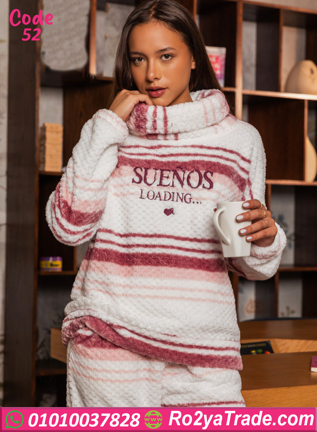 بيجامة فرو شتوي ناعمة جدًا 🤍 بخامة سوفت تقيلة ومريحة، بلوزة برقبة عالية مكتوب عليها “Suenos Loading”، مع بنطلون بنفس النقشة.