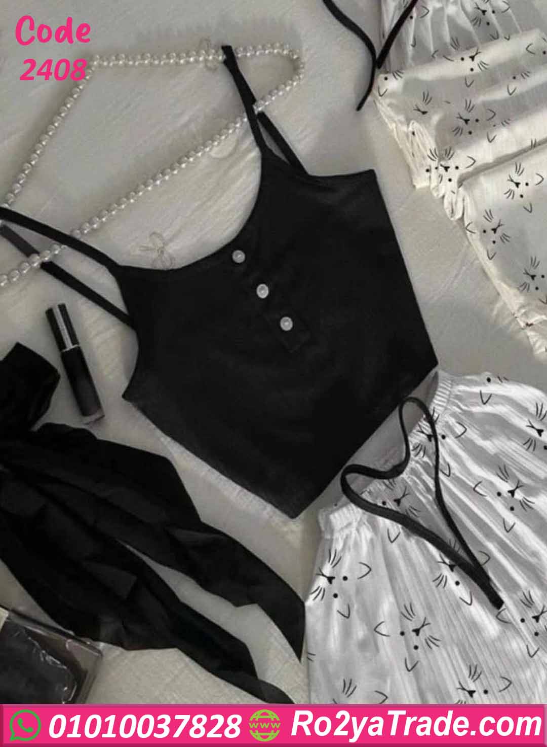 بيجامة وترنج نسائي – كود 2408 من ماركة ElRayan بتصميم قطعتين يجمع بين البساطة والأناقة. تتكون من توب أسود حمالات
