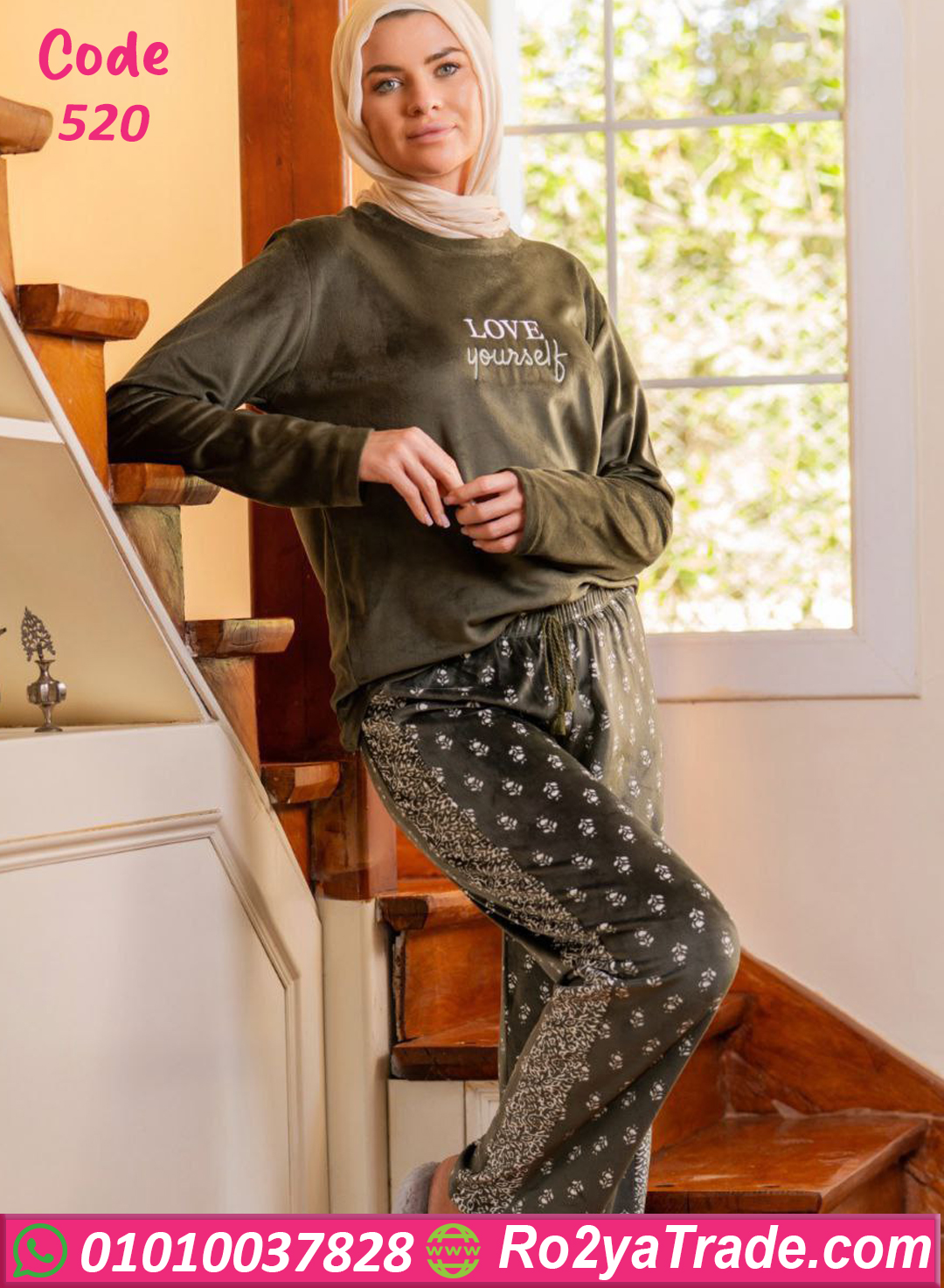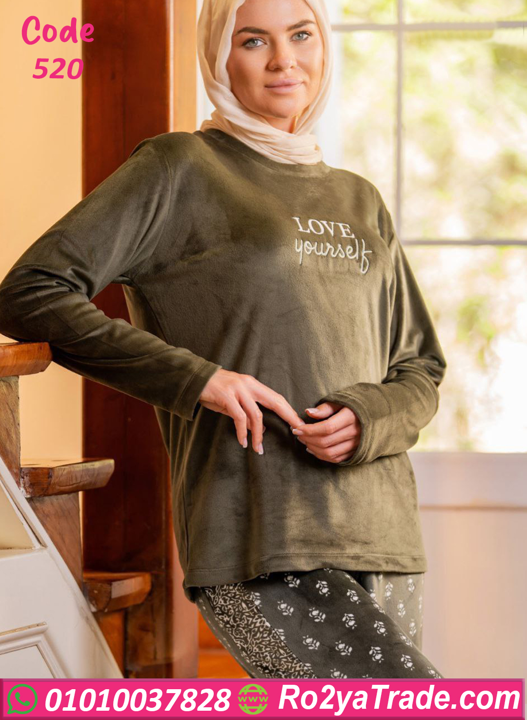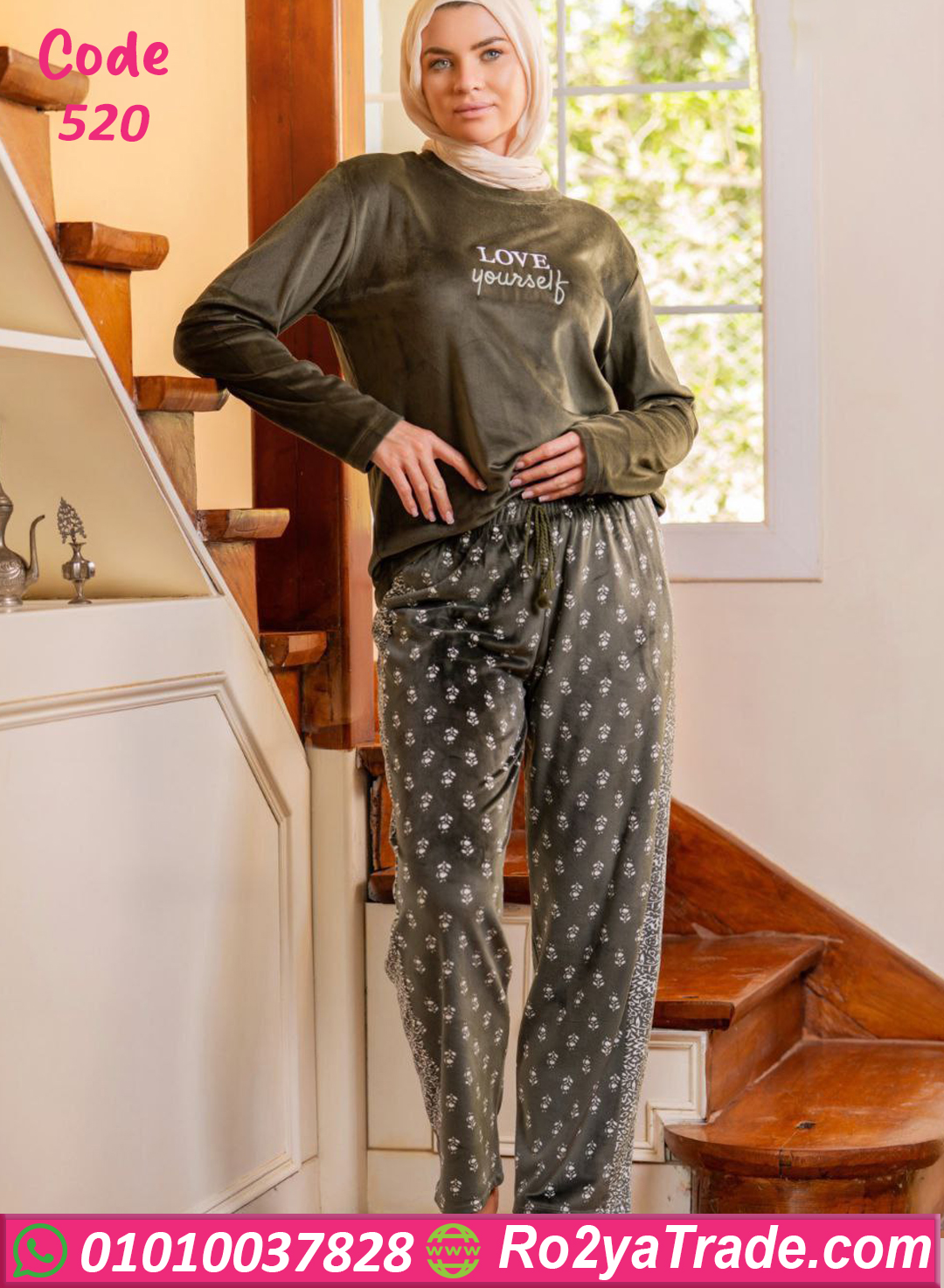 البلوزة لون زيتي هادي وعليها عبارة Love Yourself بتدي طابع رومانسي وشيك 💕 البنطلون منقوش نقشات بسيطة وجذابة وبيبقى مريح جدًا في اللبس والقعدة في البيت 💯 مناسبة للنوم، الاستقبال، أو استرخاء آخر اليوم 🔥 الخامة مش بتكلكع وسهلة الغسيل 👏 كود المنتج: 520