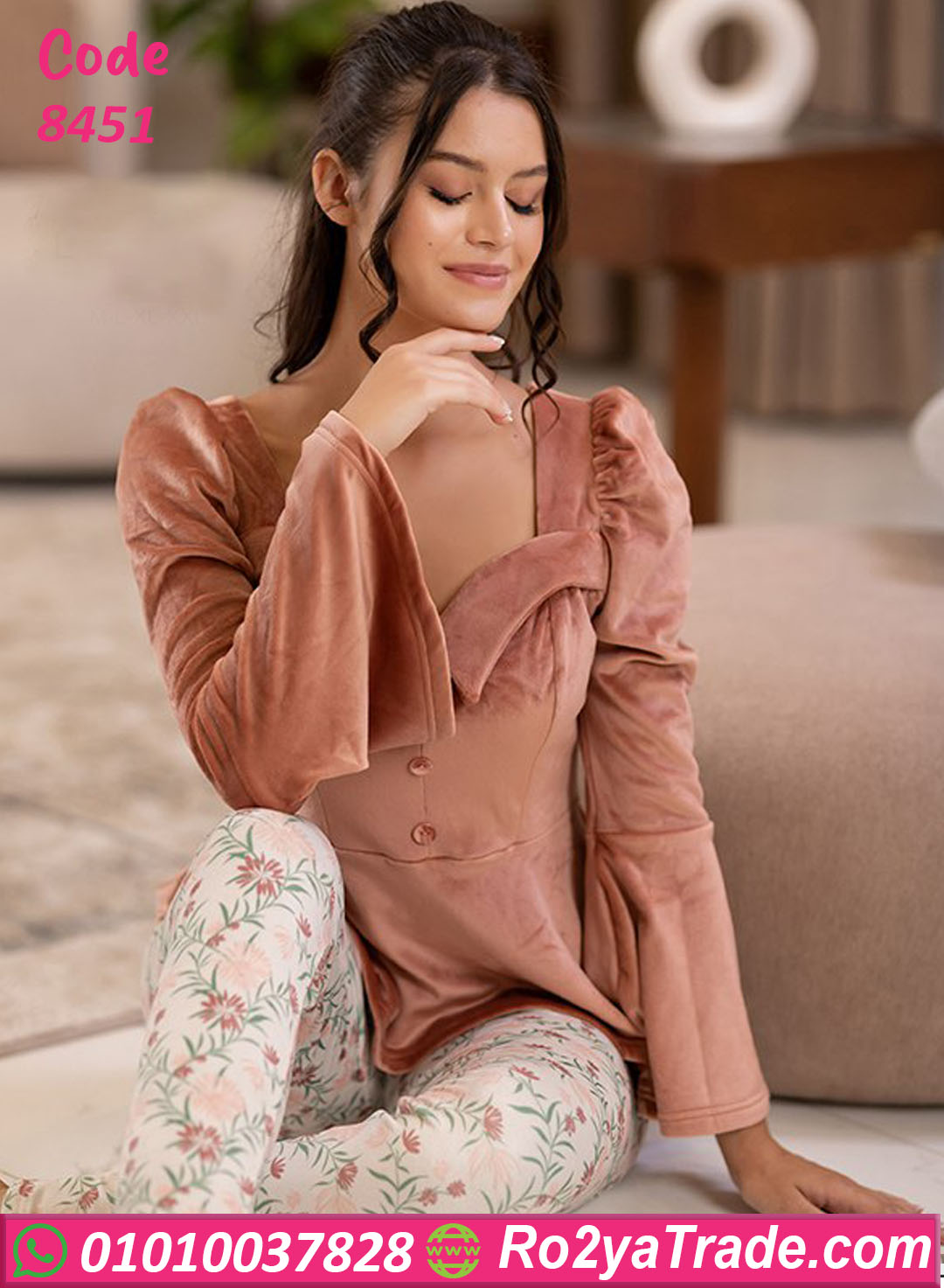 بيجامة قطيفة شتوي بأكمام منفوشة – كود 8451