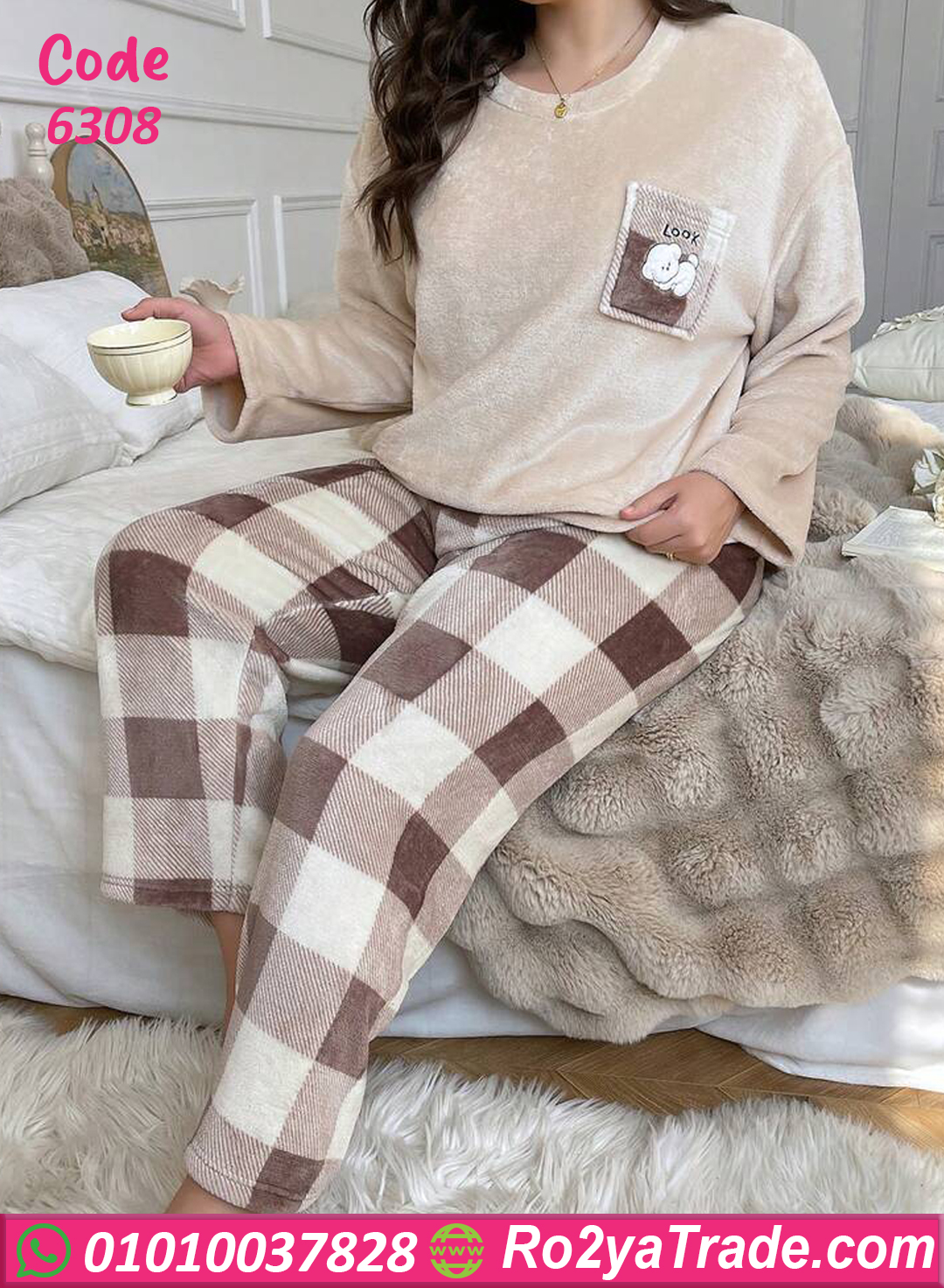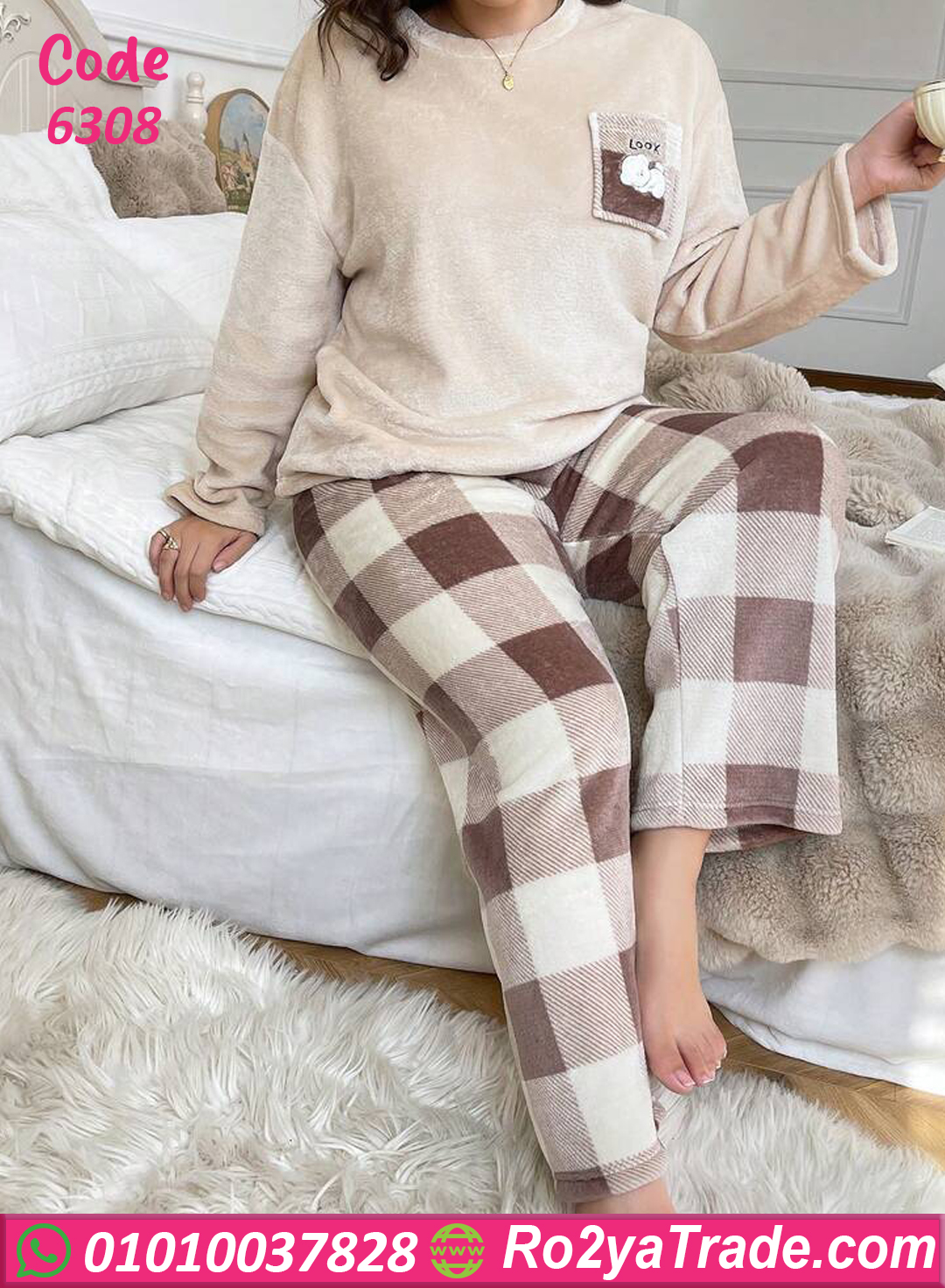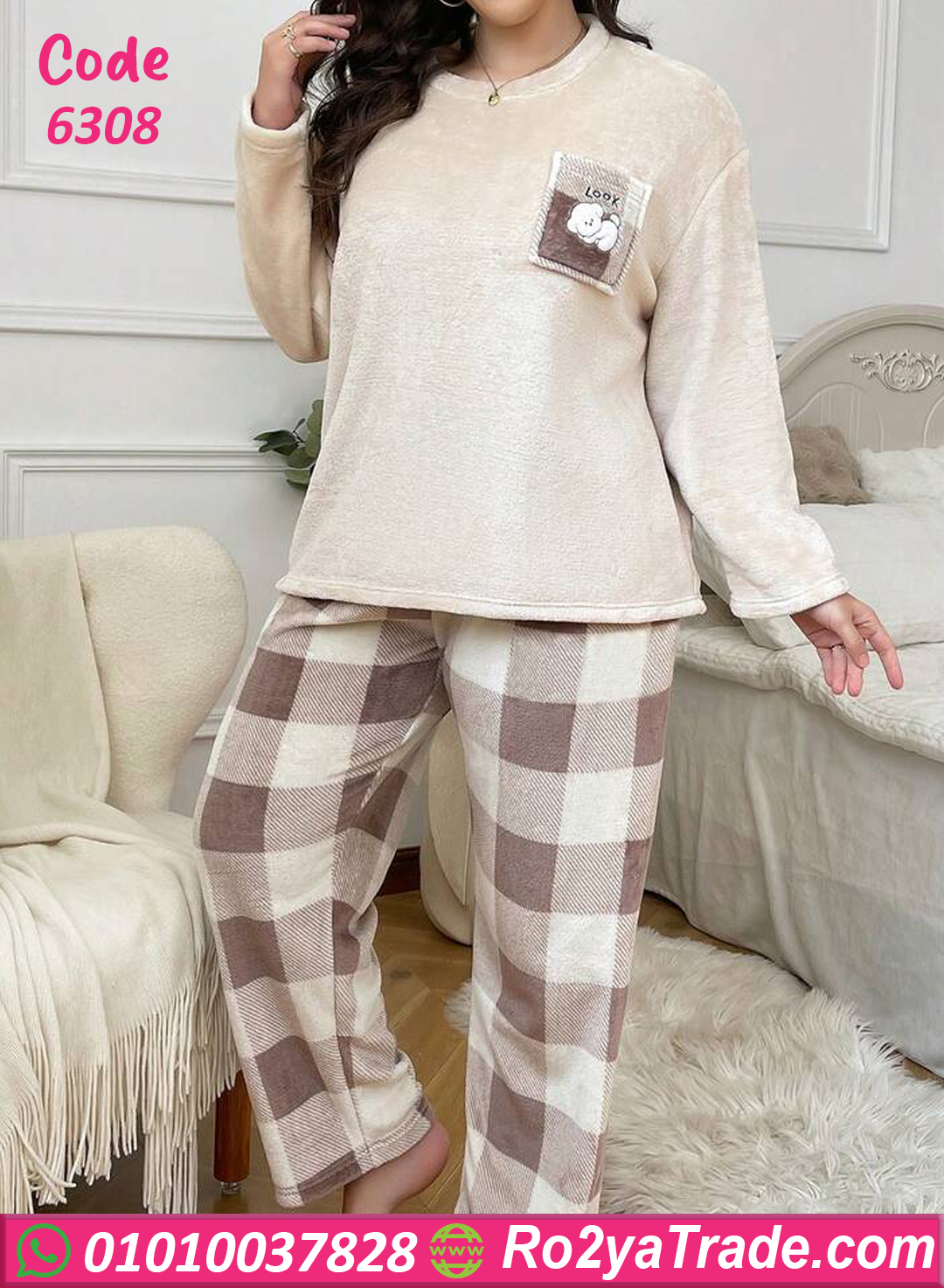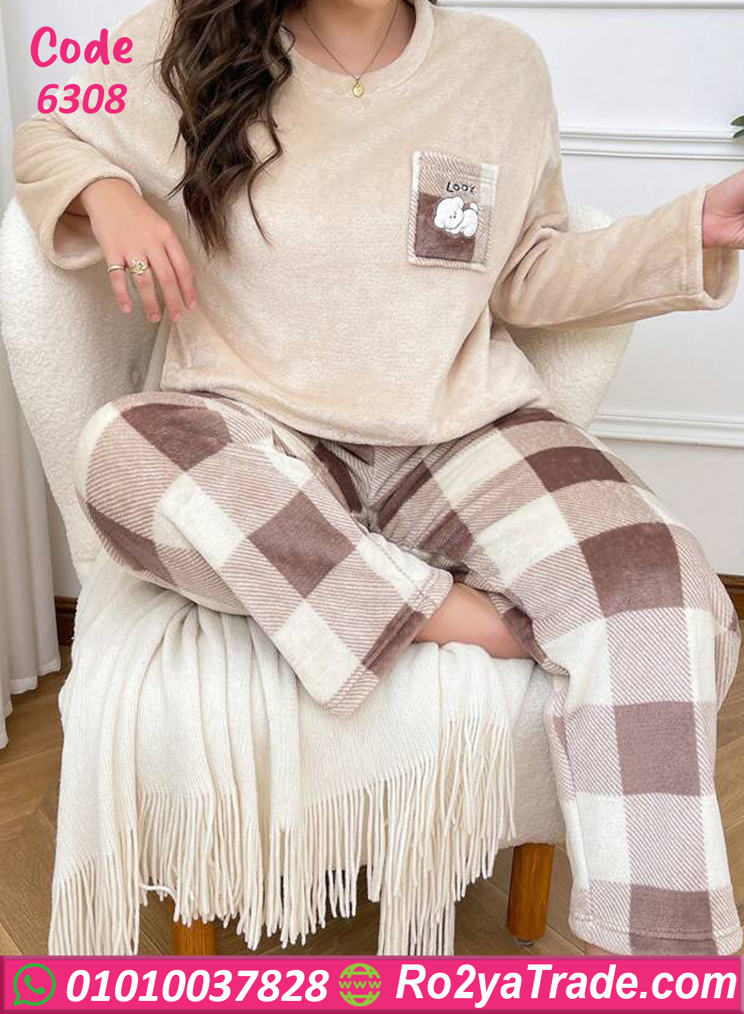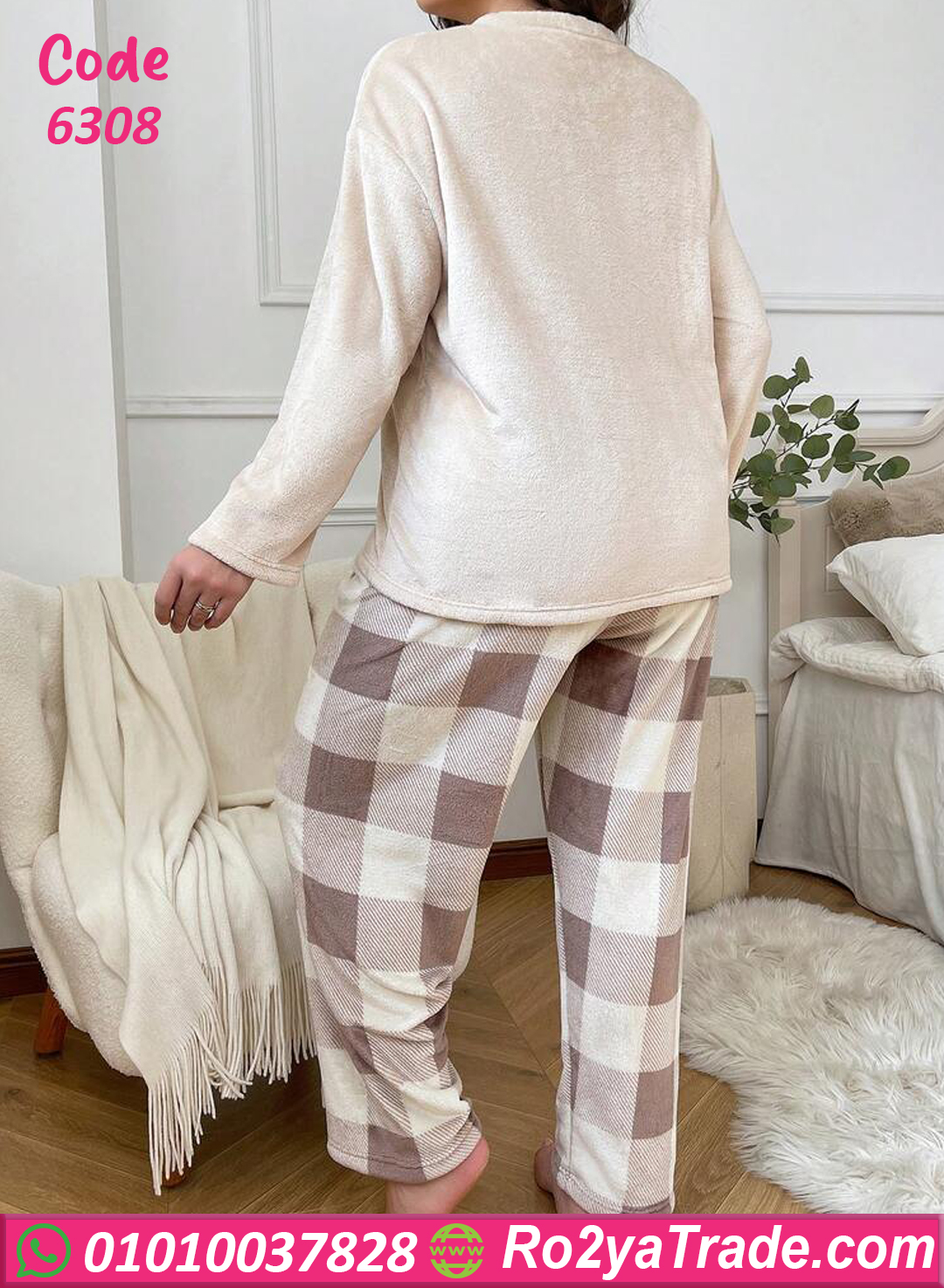 بيجامة قطيفة ناعمة بلون بيچ شيك وبنطلون كاروه مريح 🎀