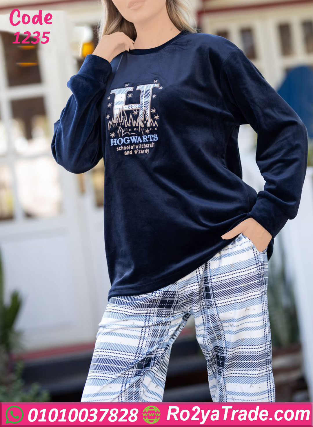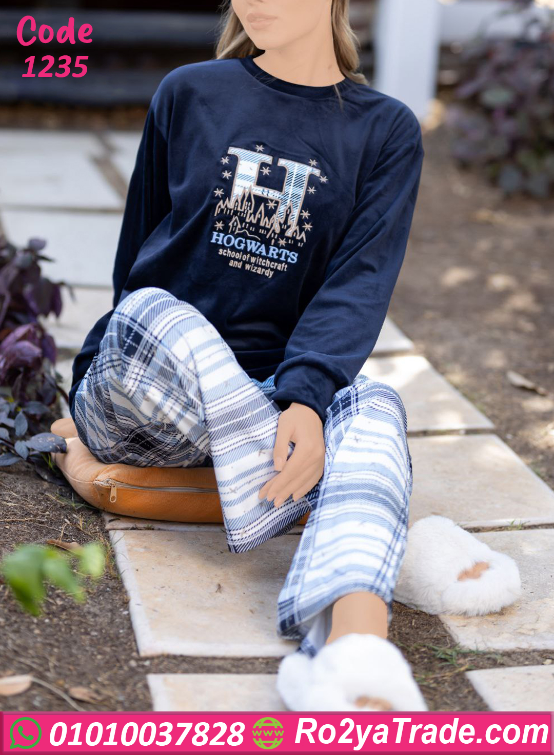 البلوفر لونه كحلي غامق بطبعة أنيقة “Hogwarts”، والبنطلون كاروه بتصميم واسع ومريح مناسب لكل المقاسات.
