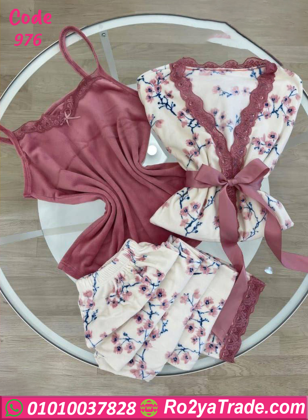 البيجامة مكونة من 3 قطع: توب قطيفة سادة باللون الروز الغامق، وبنطلون منقوش بالورود مع روب بنفس النقشة، كله متكامل لإطلالة ناعمة وأنثوية 🌸