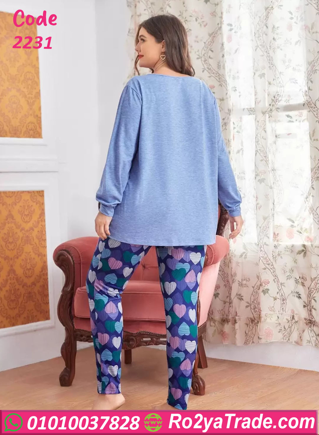 والتصميم بسيط لكن فيه لمسة أنثوية جذابة بطباعة القلوب على البنطلون والتيشيرت الأزرق الناعم.