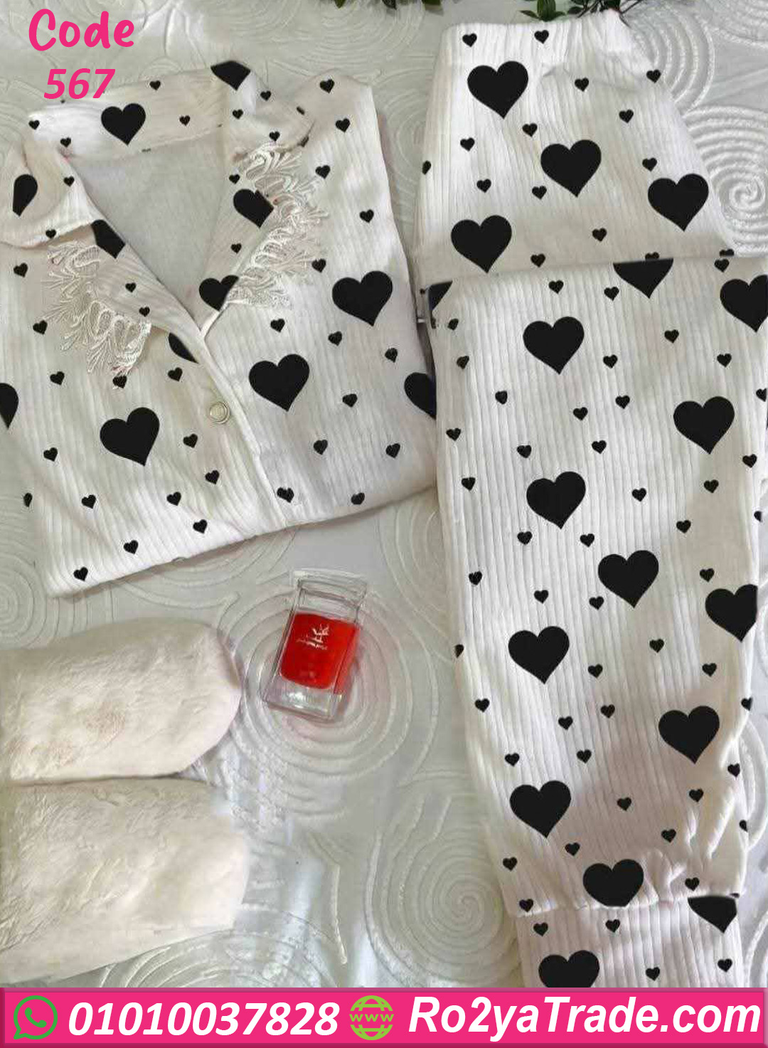 الموديل عبارة عن طقم بيجامة مكون من قطعتين بتصميم قلوب جذاب يعطي لمسة أنثوية رقيقة ومظهر مميز داخل المنزل.
