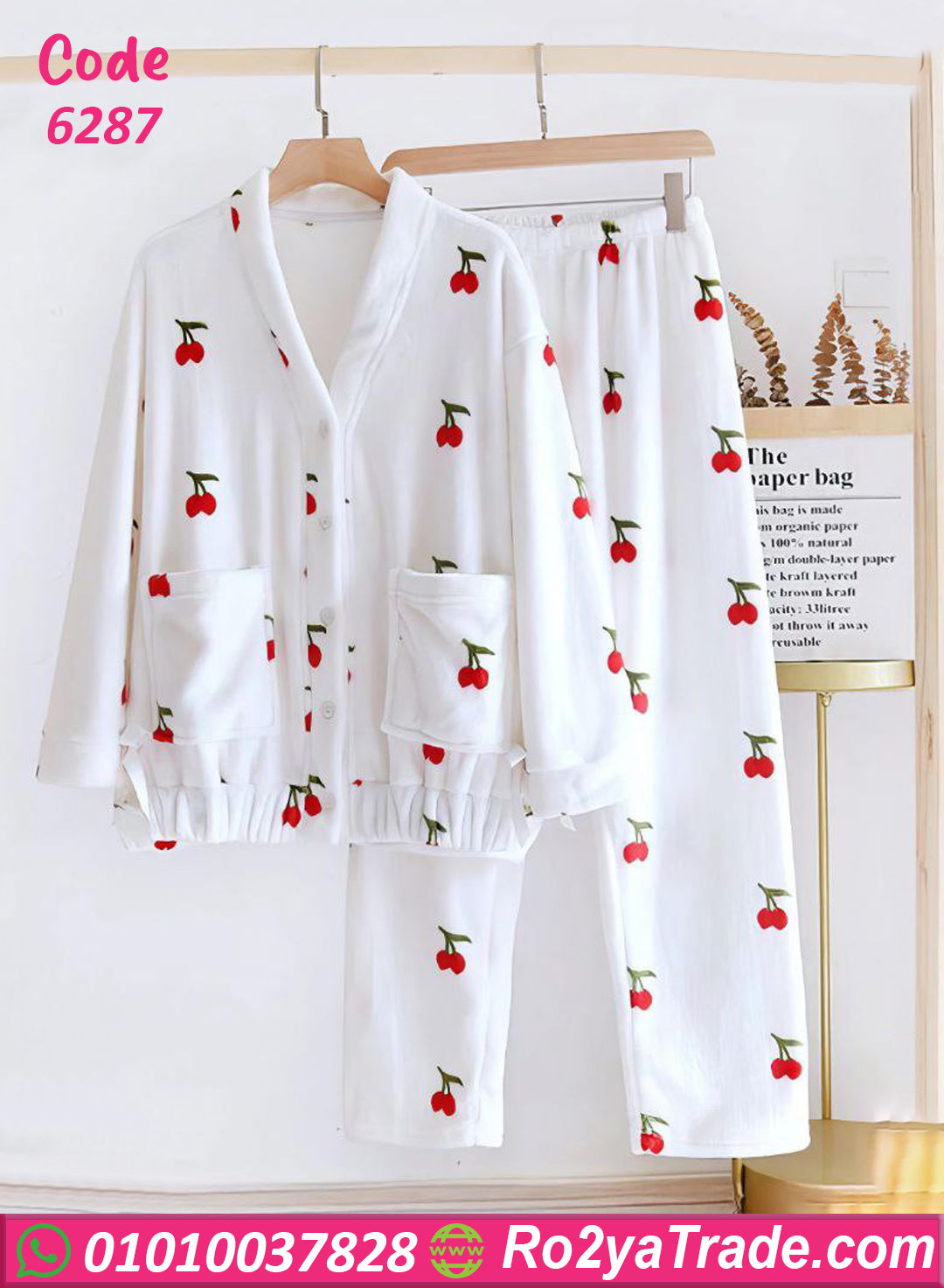 بيجامة شتوي كيوت بنقشة كرز 🍒 خامة قطيفة ناعمة جدًا مريحة ودافئة، مثالية للبيت والمناسبات الشتوية.