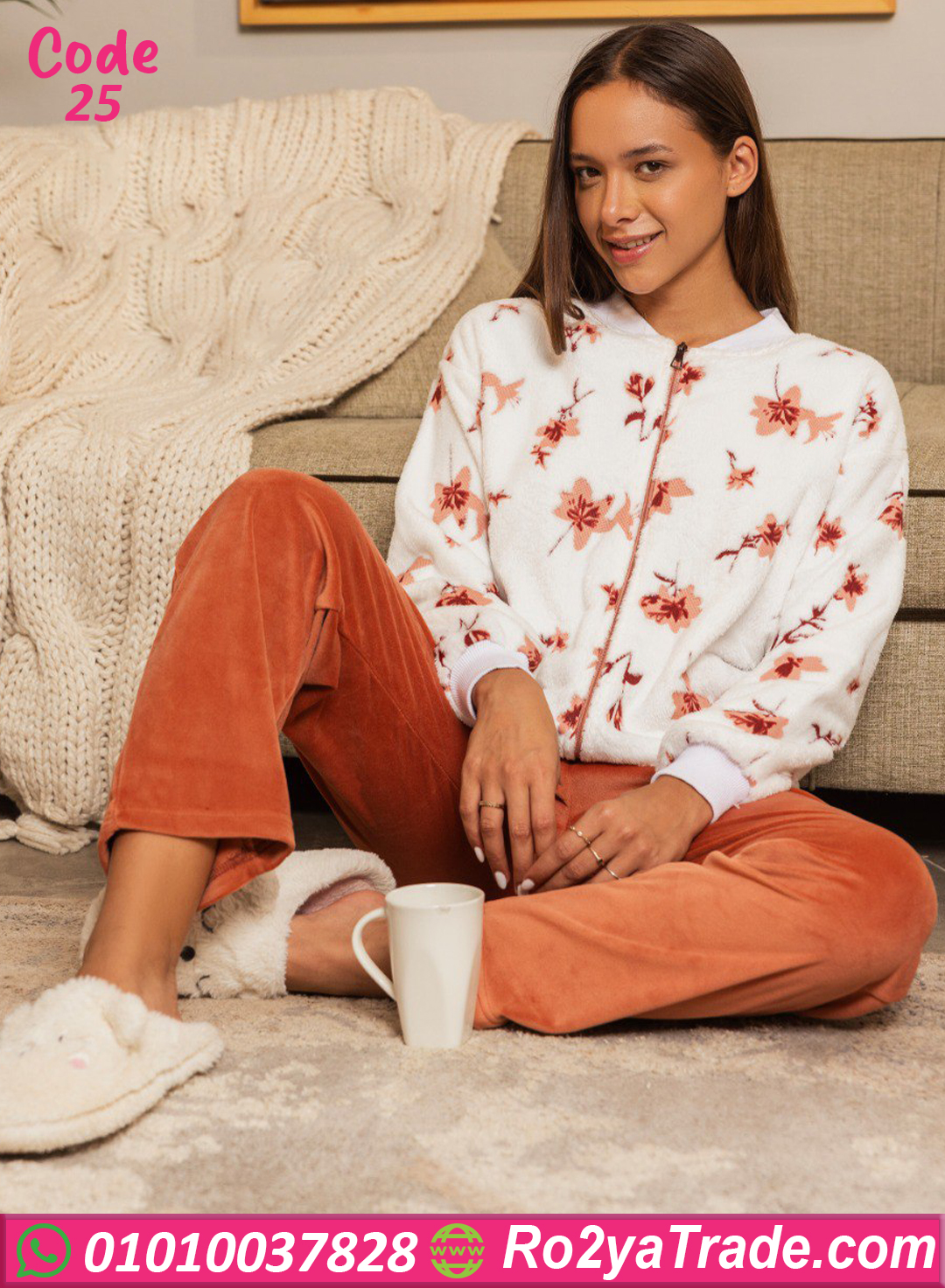 دلّعي نفسك في ليالي الشتاء الباردة مع بيجامة كود 25 من ماركة ALMA 💕 البيجامة بخامة قطيفة ناعمة جدًا على الجسم ومريحة في اللبس، العلوية بتصميم سحاب وسهل اللبس والنزع، مطرزة برسومات ورود ناعمة تضيف لمسة أنثوية، والبنطلون بلون مشمشي جذاب بيكمل الإطلالة. مثالية للسهرات المريحة في البيت أو بعد الدش الدافي، بتجمع بين الدفا والأناقة في طقم واحد 😍