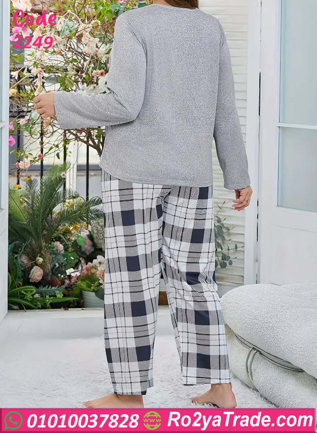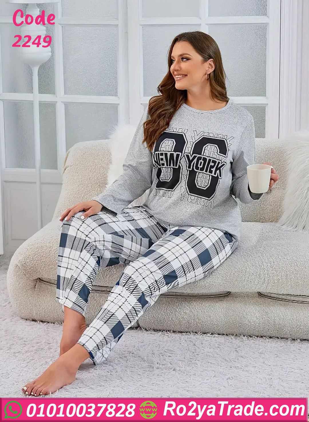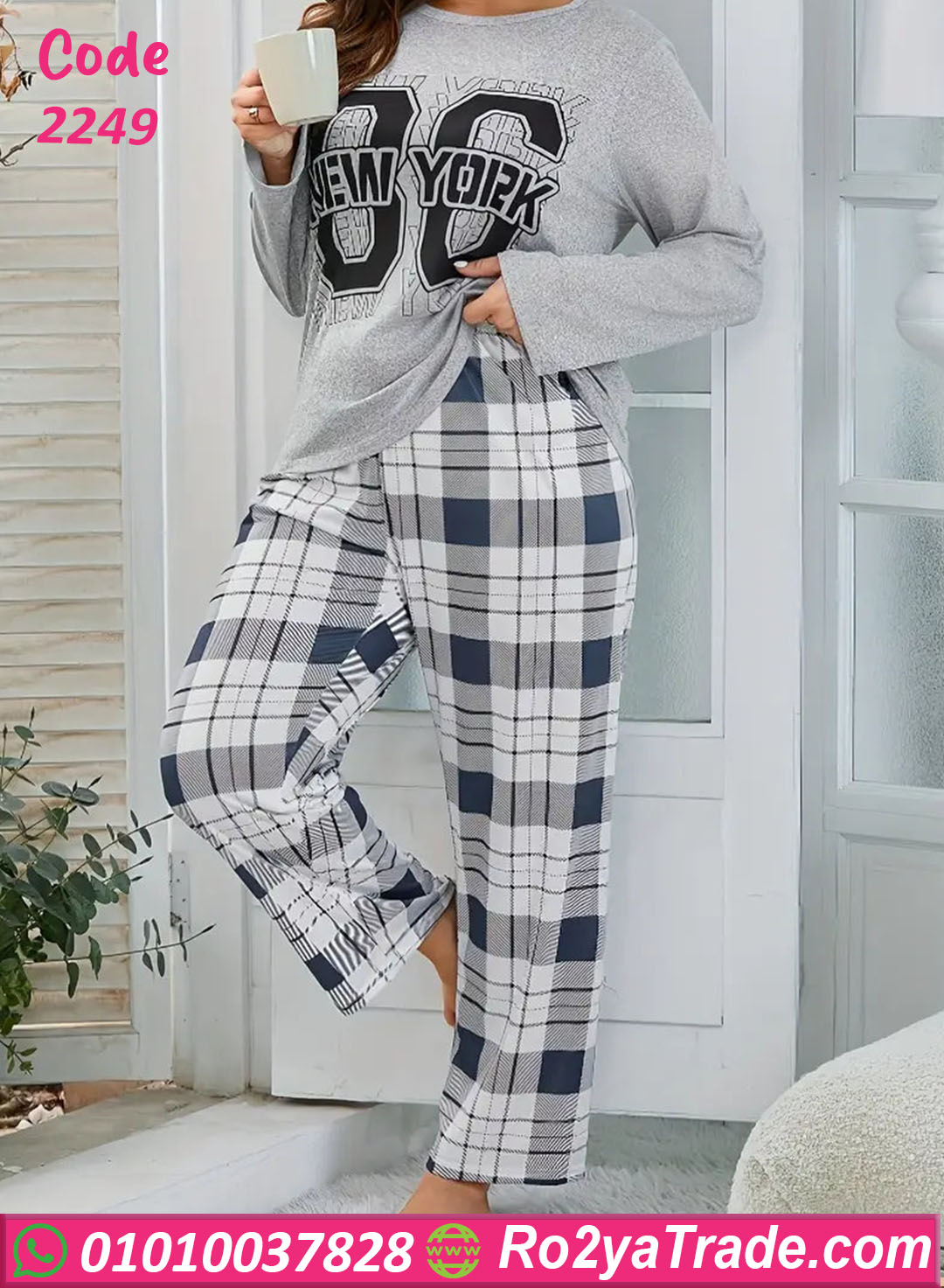 البلوزة لونها رمادي هادي بتصميم عصري مطبوع عليه كلمة New York 96 بشكل شبابي جدًا، والبنطلون بنقشة كارو أنيقة بالأبيض والرمادي بتدي شكل شيك ومريح.