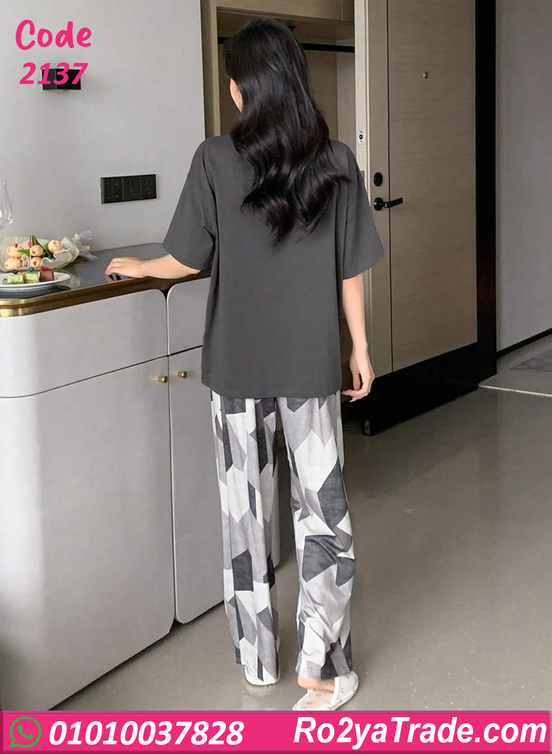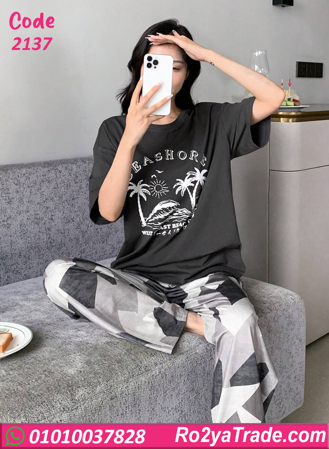 بيجامة وترنج حريمي صيفي بخامة خفيفة وناعمة، تيشيرت نص كم بلون غامق مع طبعة كاجوال، وبنطلون واسع بطبعة هندسية مريحة، مناسب جدًا للبيت والنوم والراحة اليومية.