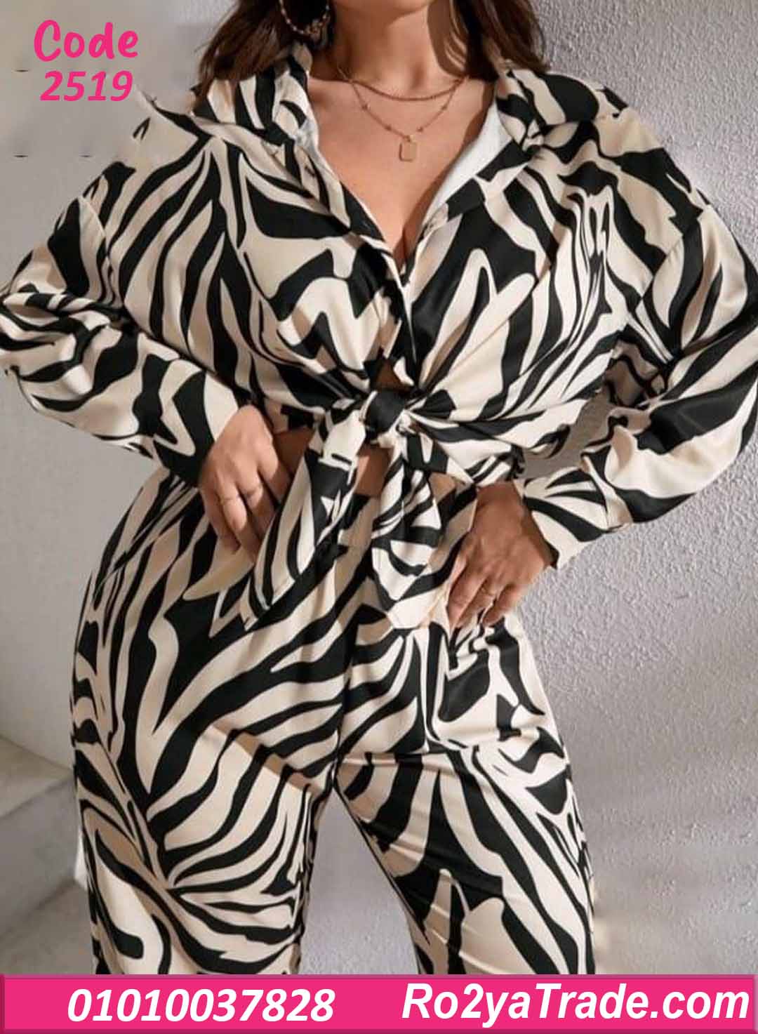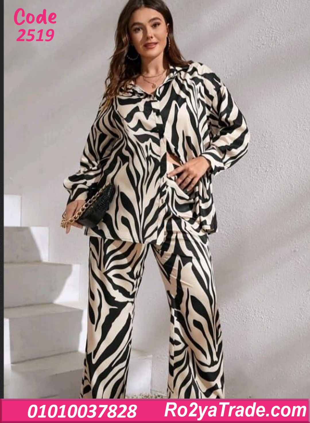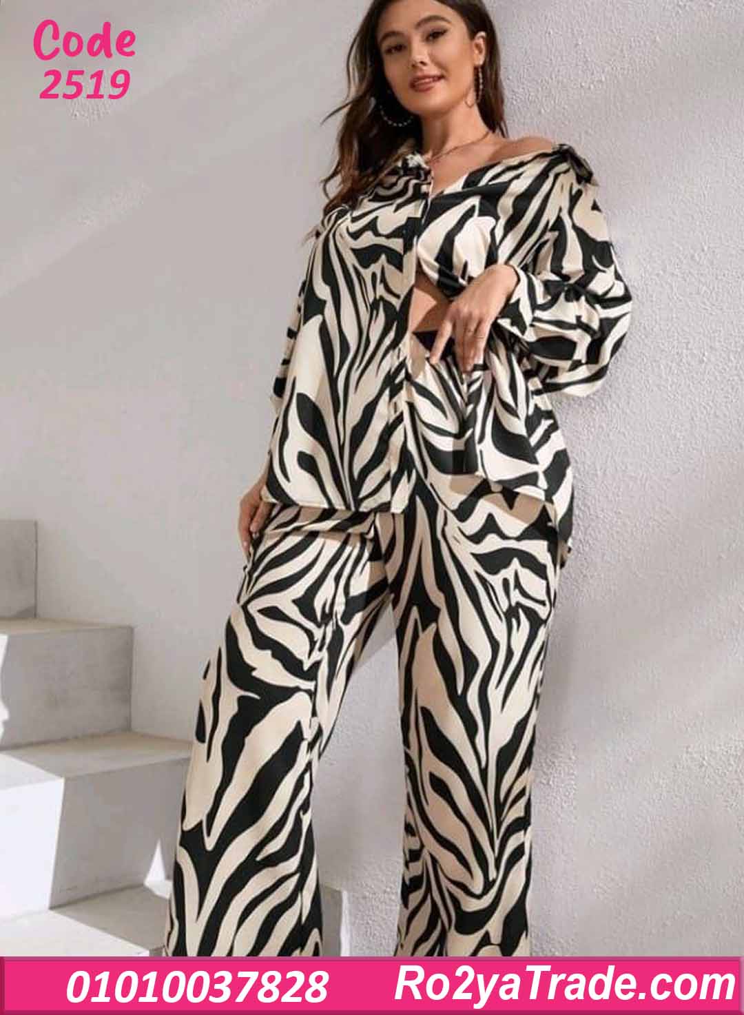 الطقم مكون من قميص واسع بأكمام طويلة وياقة كلاسيك، مع بنطلون واسع مريح بقصة مستقيمة. النقشة تايجر بدرجات الأسود مع البيج والأوف وايت، مدياله لوك جريء وملفت جدًا.
