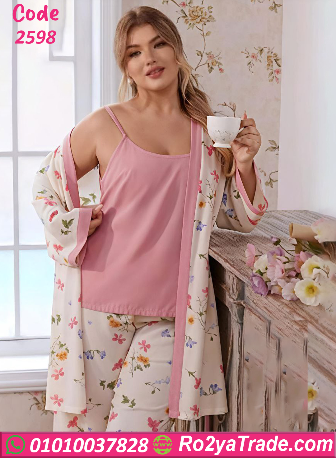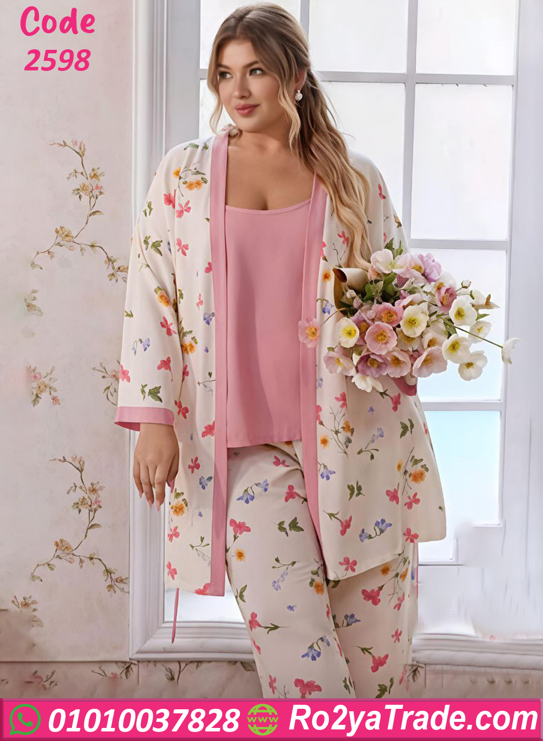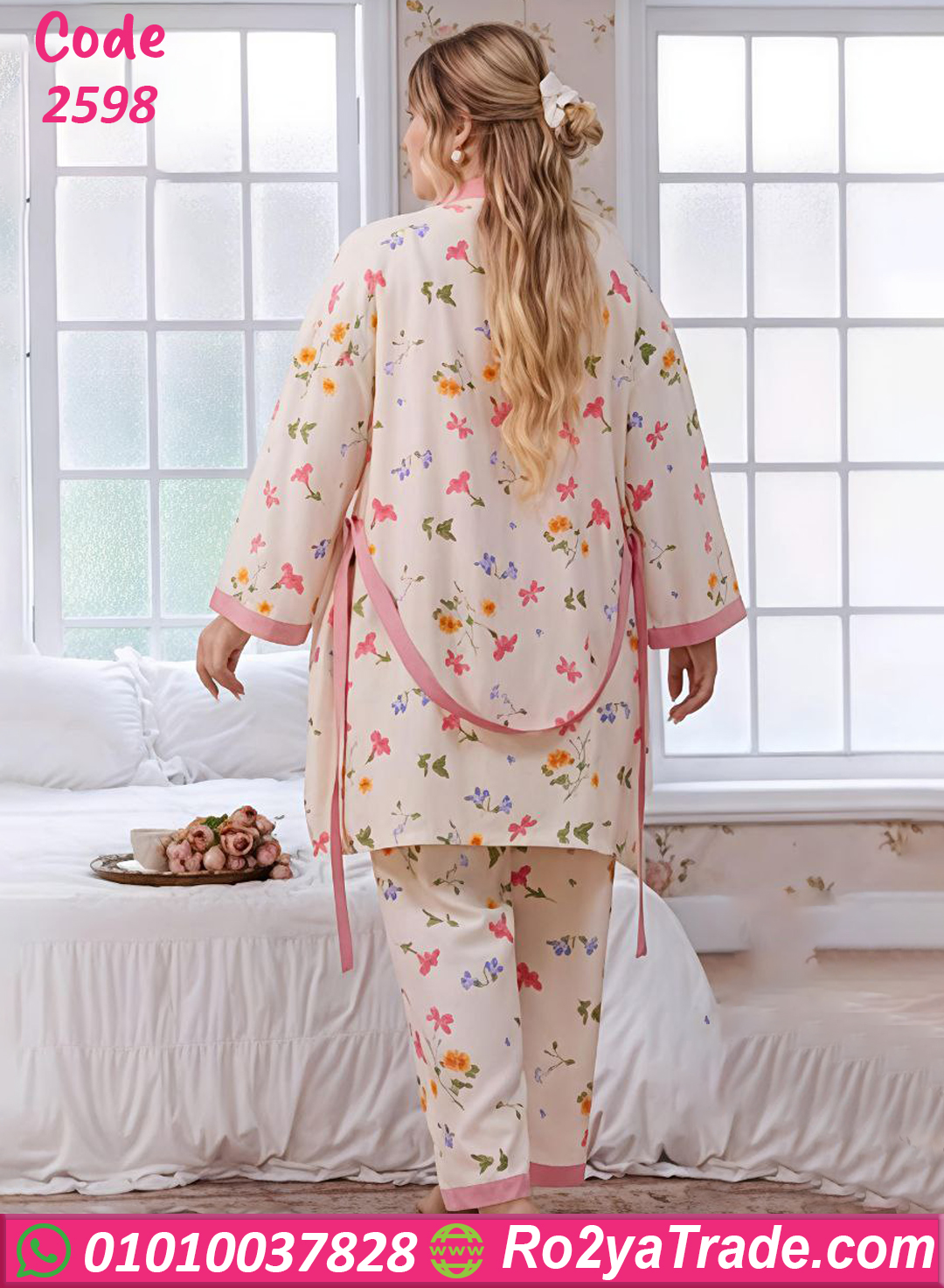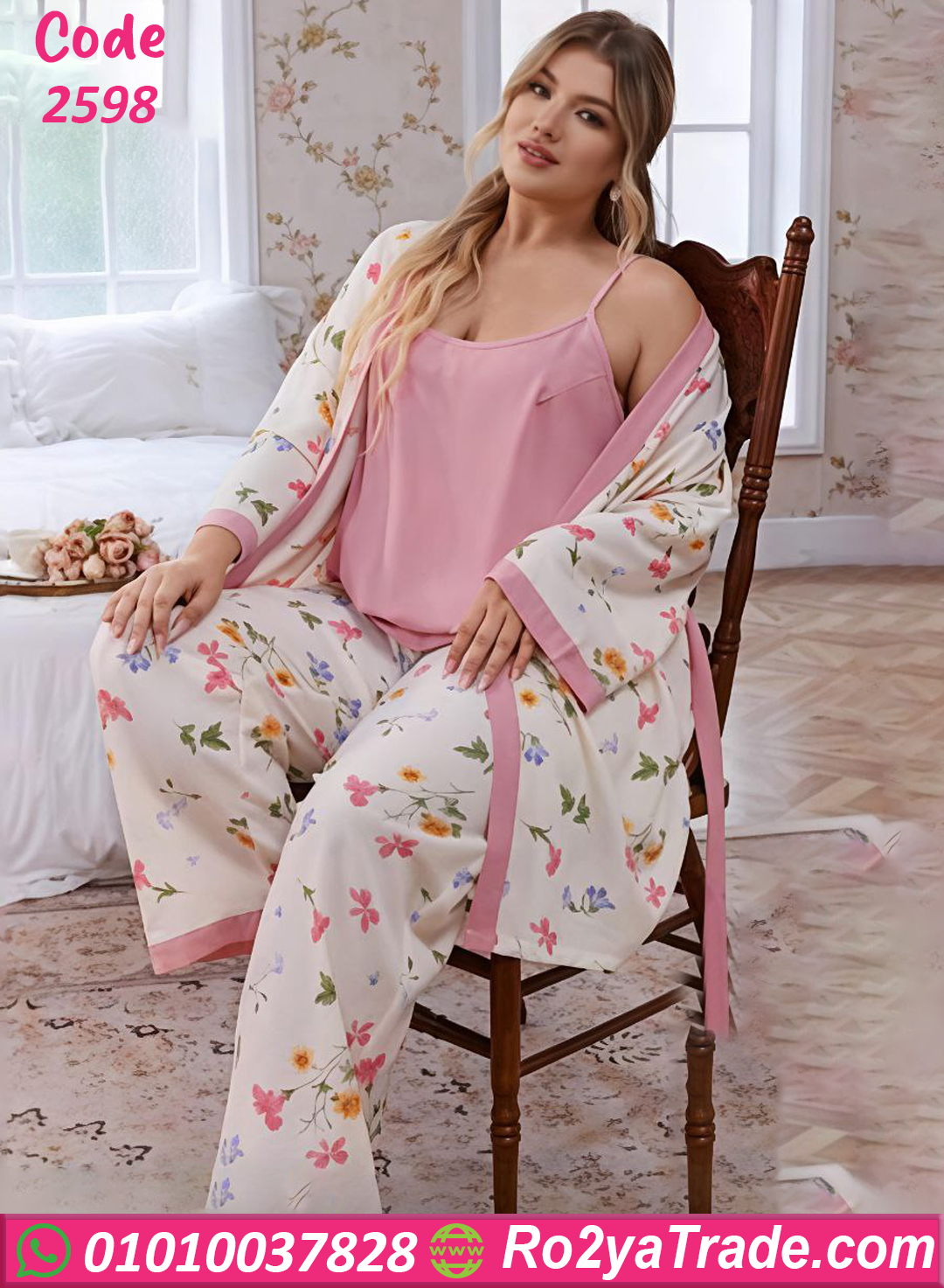 بيجامة حريمي أنيقة مكونة من 3 قطع بتصميم ورد رقيق يمنحك إطلالة ناعمة ومريحة داخل المنزل مع لمسة أنثوية جذابة.