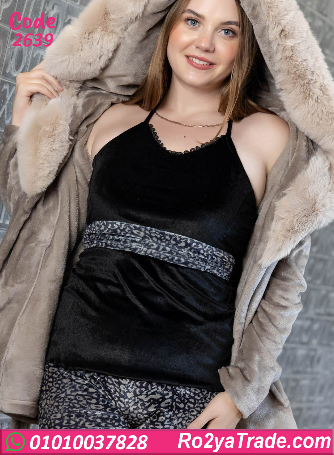 بيجامه نسائي شتوي بخامة قطيفة عالية الجودة، مزود بكابيشو كبير بفرو ناعم وحزام لربط الوسط يبرز القوام بشكل أنيق. تصميم عملي ومريح، طوله مناسب للاستخدام اليومي وبيوفر حرية حركة كاملة. ينفع للبس في البيت، بعد الشاور، أو في أوقات الاسترخاء، وقطعة أساسية لكل ست بتحب الدفا مع الشكل الراقي في الشتاء. كود 2639